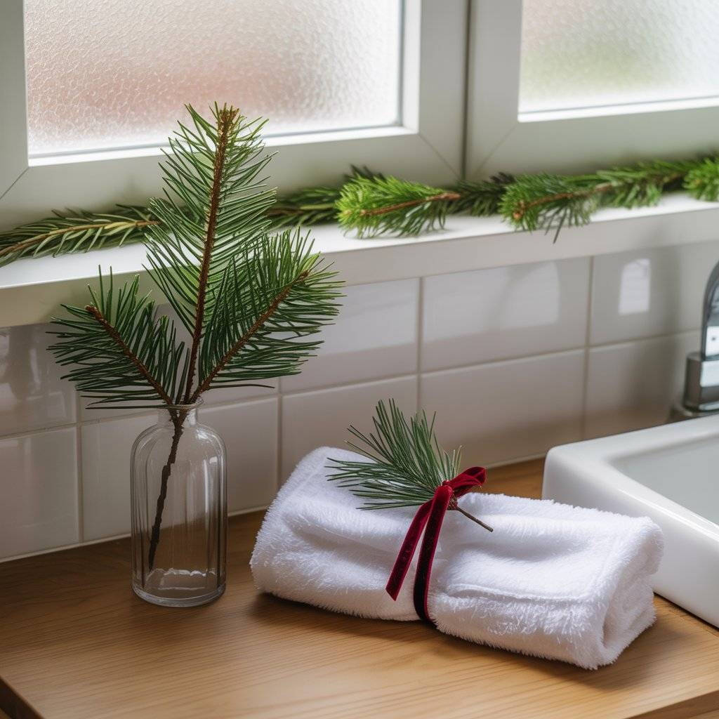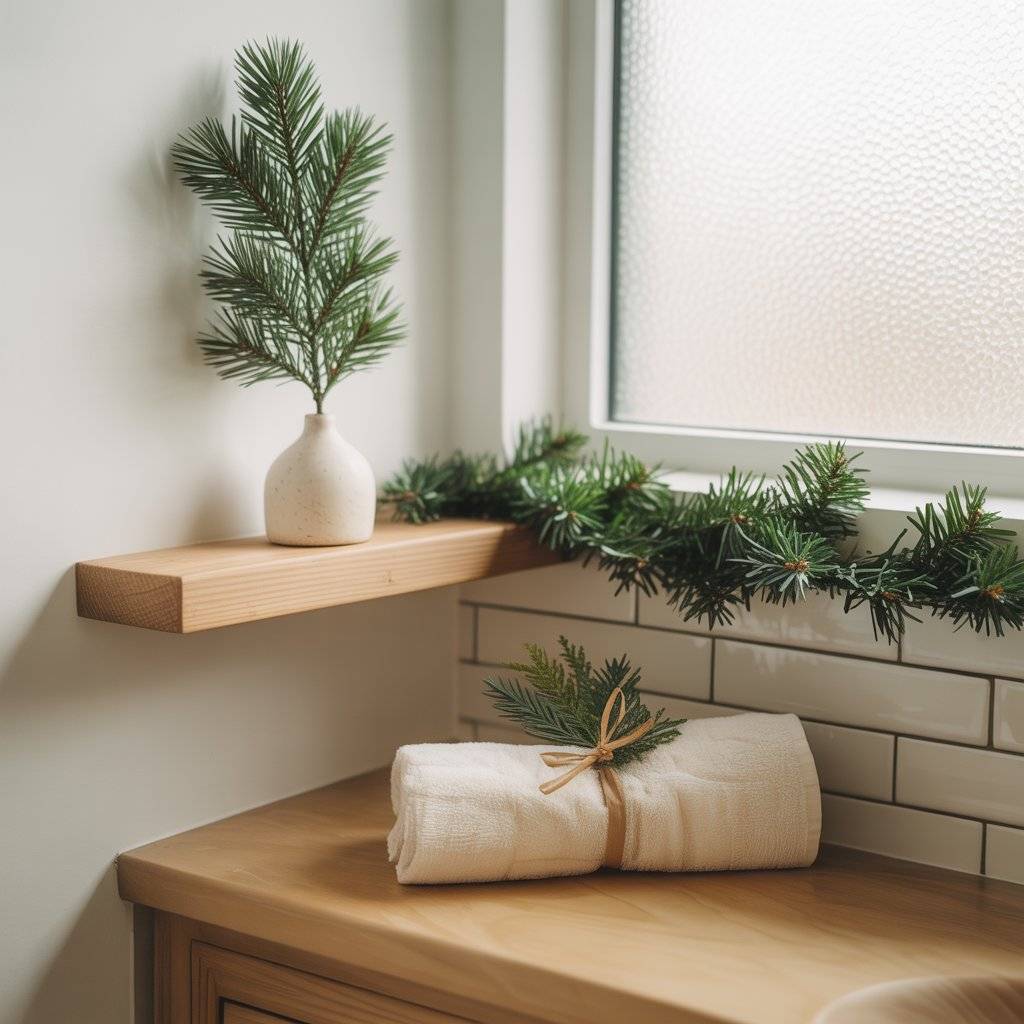 You only need one or two pieces: a little stem in a vase, a thin garland on a shelf, or even a tiny sprig tied around a rolled towel. It gives the room that “winter holiday” feeling without making it look busy.