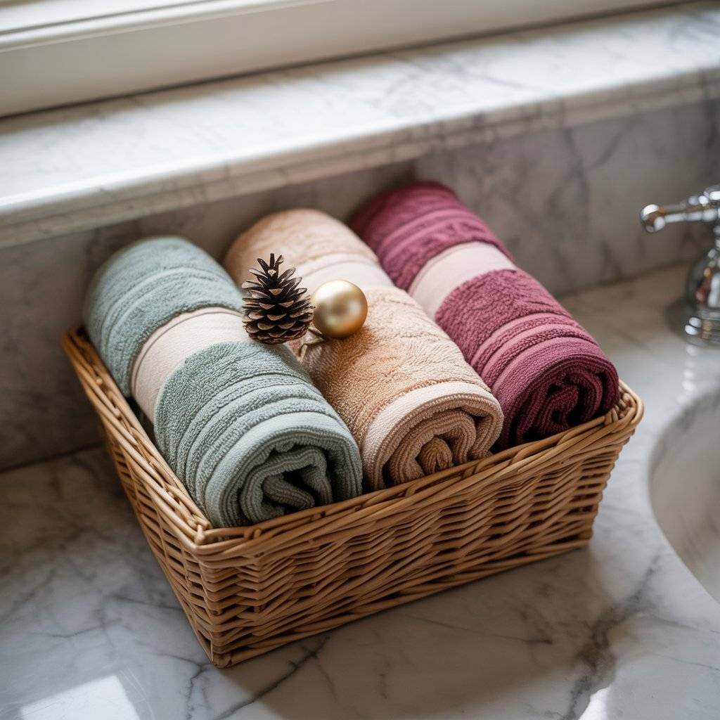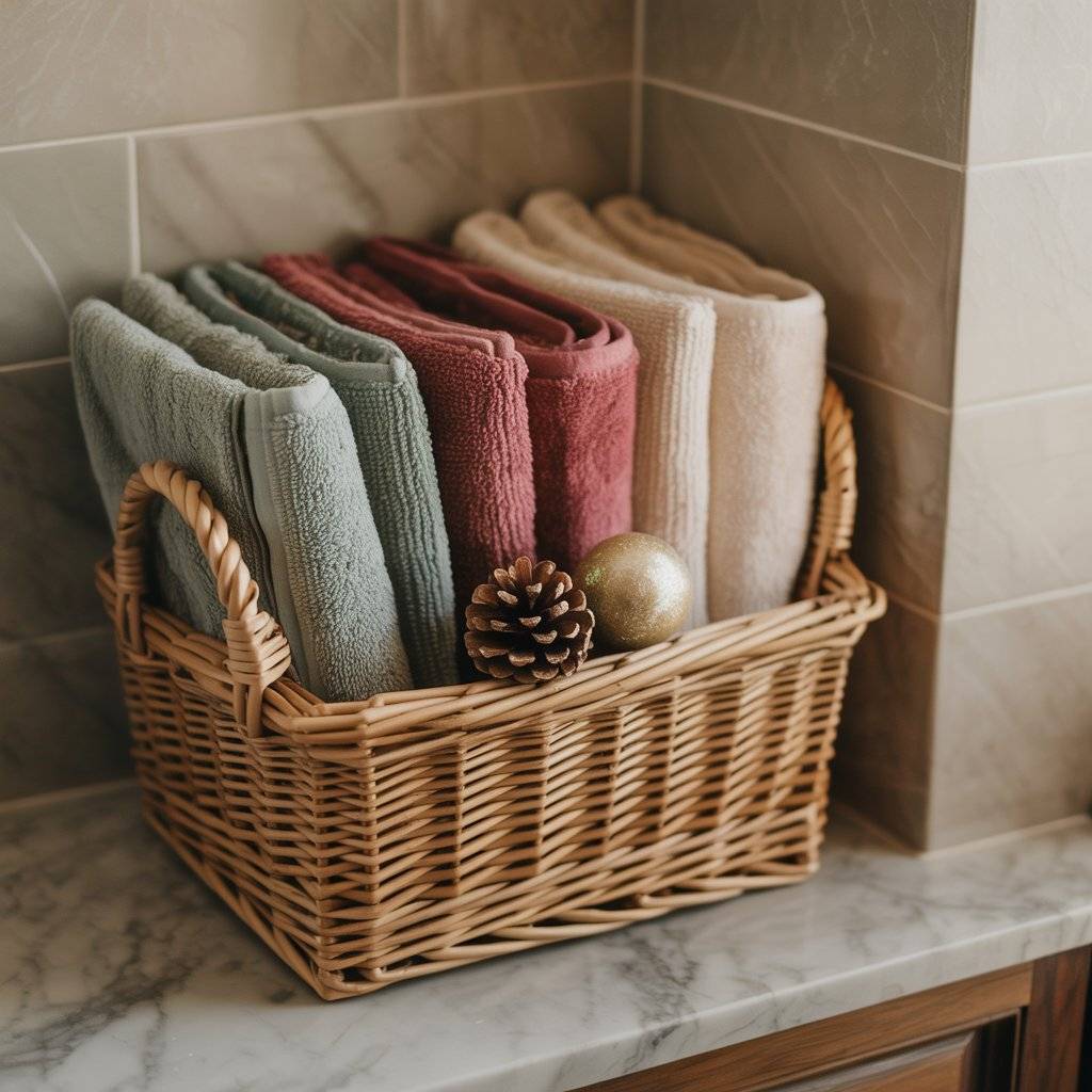 A small wicker or fabric basket filled with neatly rolled towels or washcloths can double as decoration and storage. Swap in towels in muted reds, soft greens, or golds to hint at Christmas.