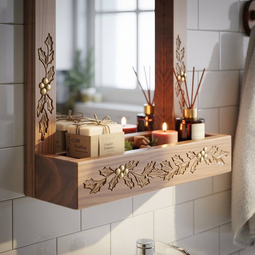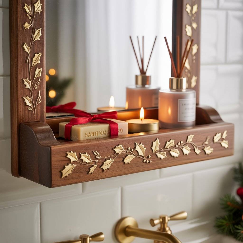 A small shelf can make a big impact in your holiday bathroom. Swap a plain shelf for one with subtle Christmas touches think a wooden shelf with carved holly, tiny stars, or gold accents. It’s perfect for holding festive soaps, a small candle, or a holiday diffuser, keeping the space tidy while spreading cheer.