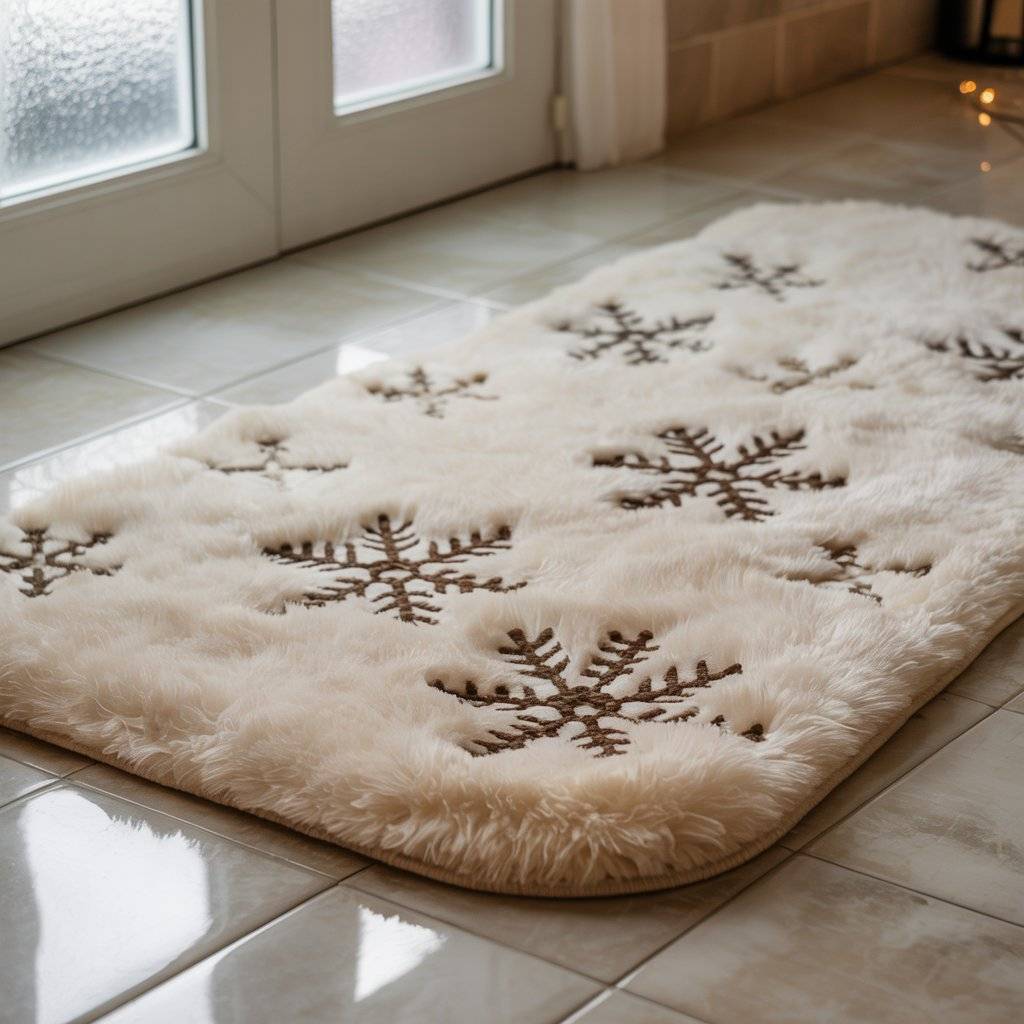 Go for something thick and gentle under the feet. A cream or taupe rug with a subtle winter pattern works beautifully, or you can choose a simple woven one that blends into your holiday theme without shouting “Christmas.”