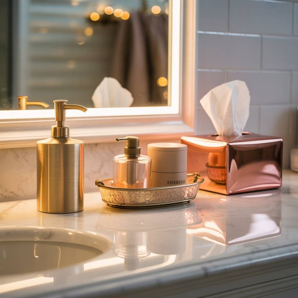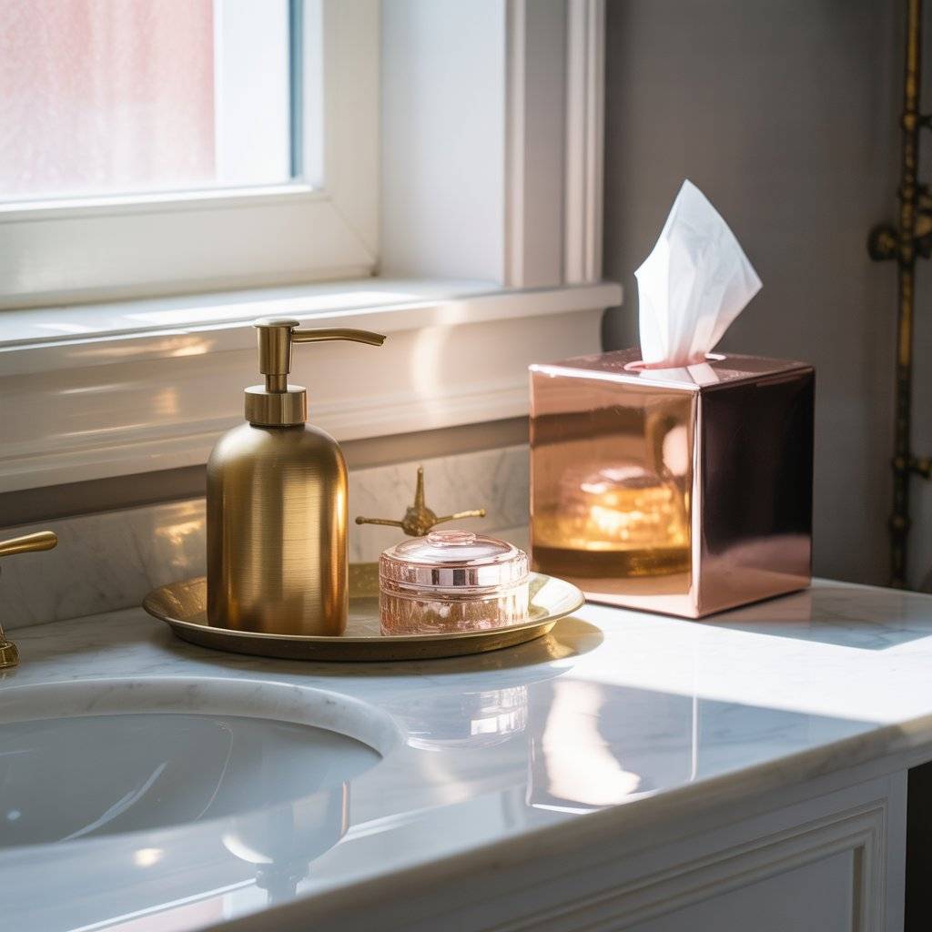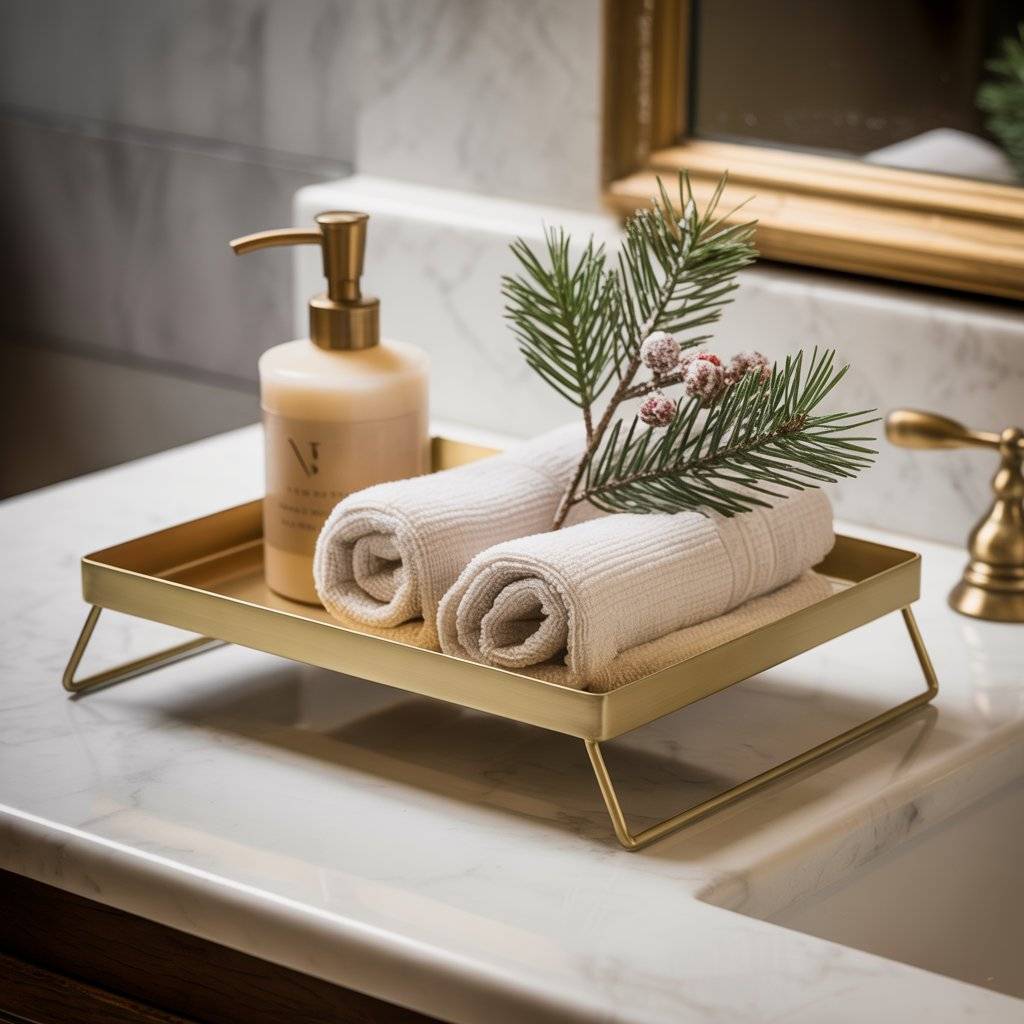 You could switch your soap dispenser to a gold one, use a small metallic tray on the counter, or even place a soft champagne-colored tissue box. These tiny changes bring that quiet holiday glow without making the room feel crowded.