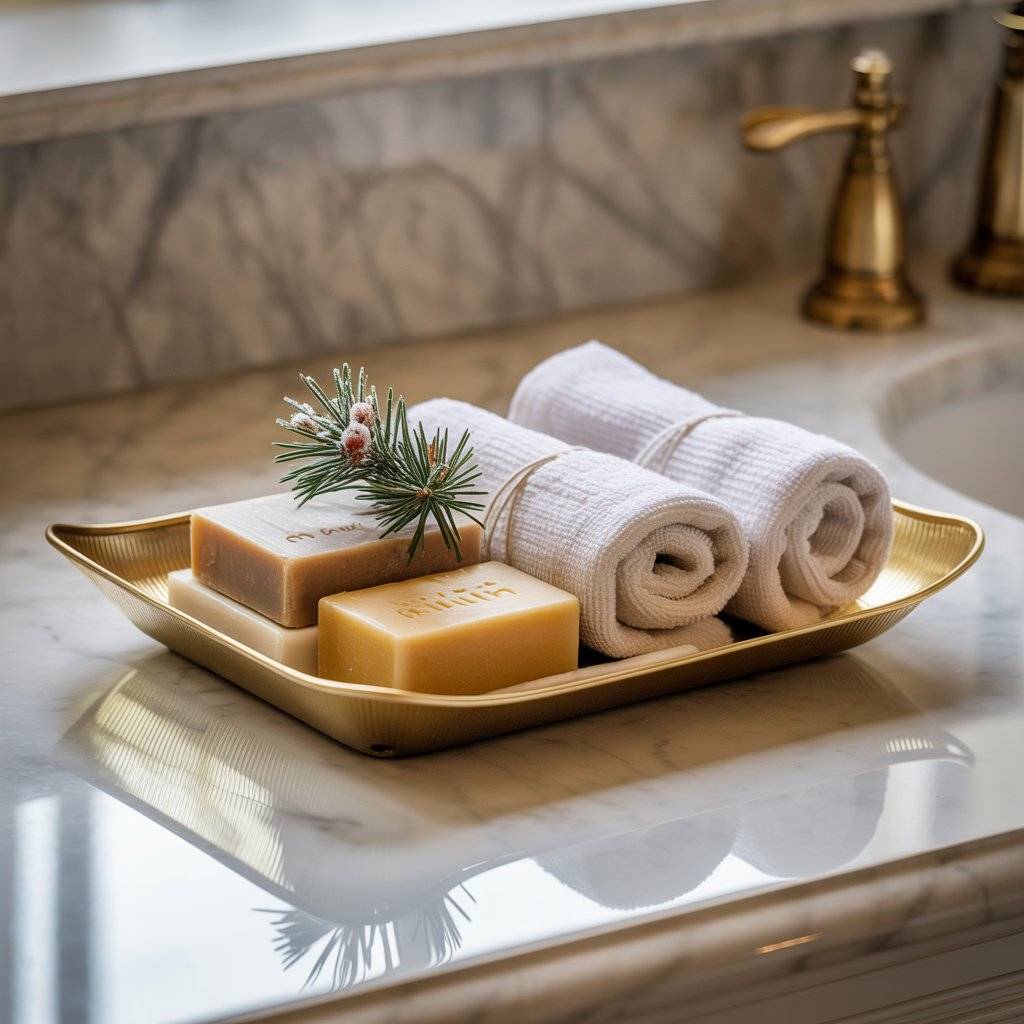 A vanity tray is a small thing, but it makes the bathroom feel organized and gently decorated for Christmas. You can place your soap, a few rolled hand towels, or a small winter decoration on it to keep everything in one tidy spot.