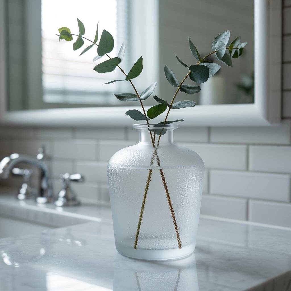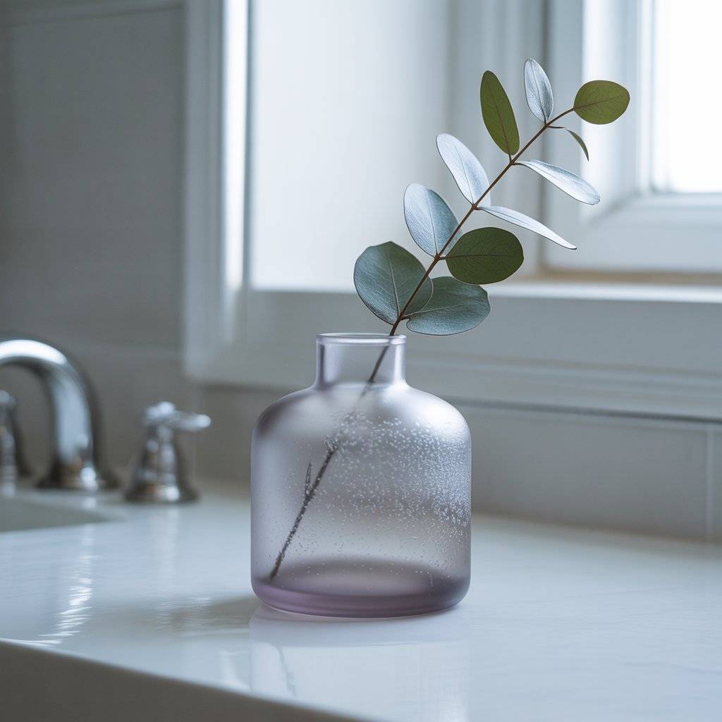 The frosted vase adds that cool, snowy look, and the single stem keeps everything clean and uncluttered perfect for a bathroom.