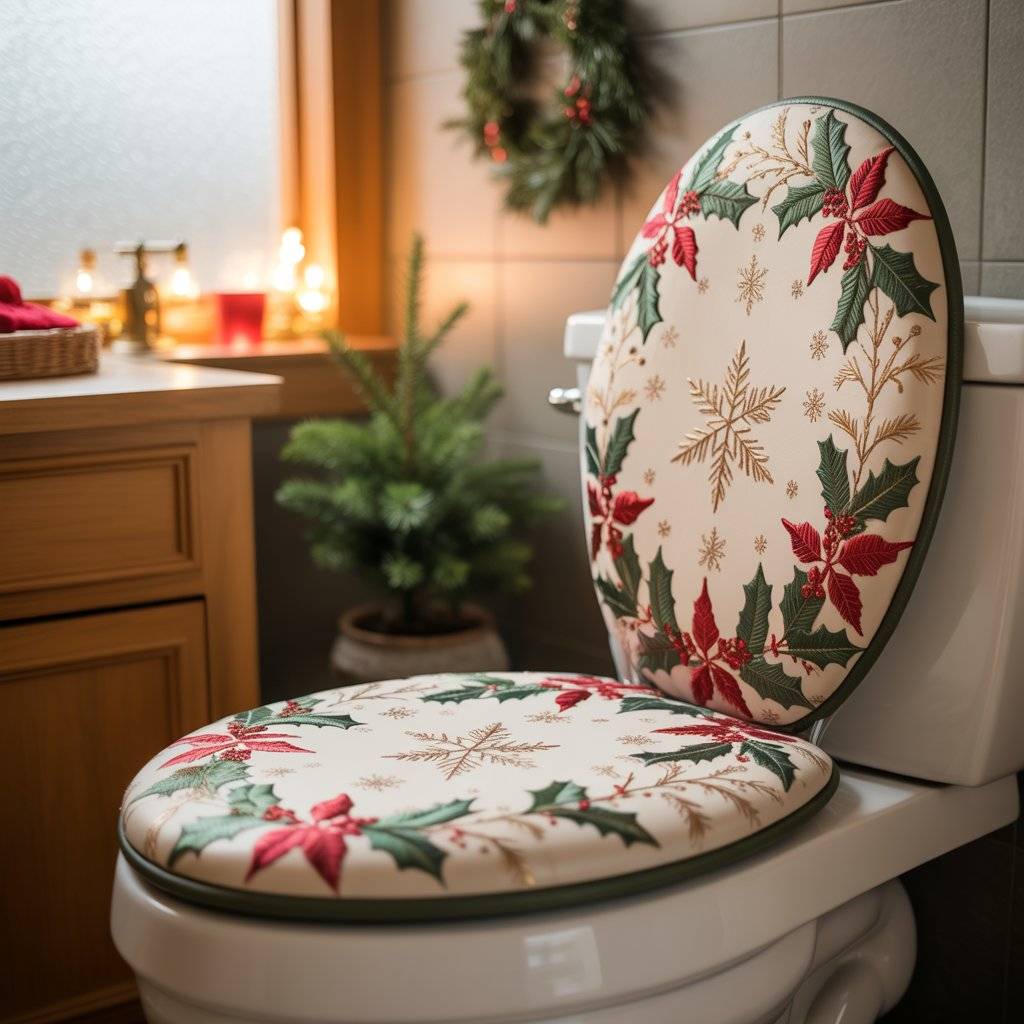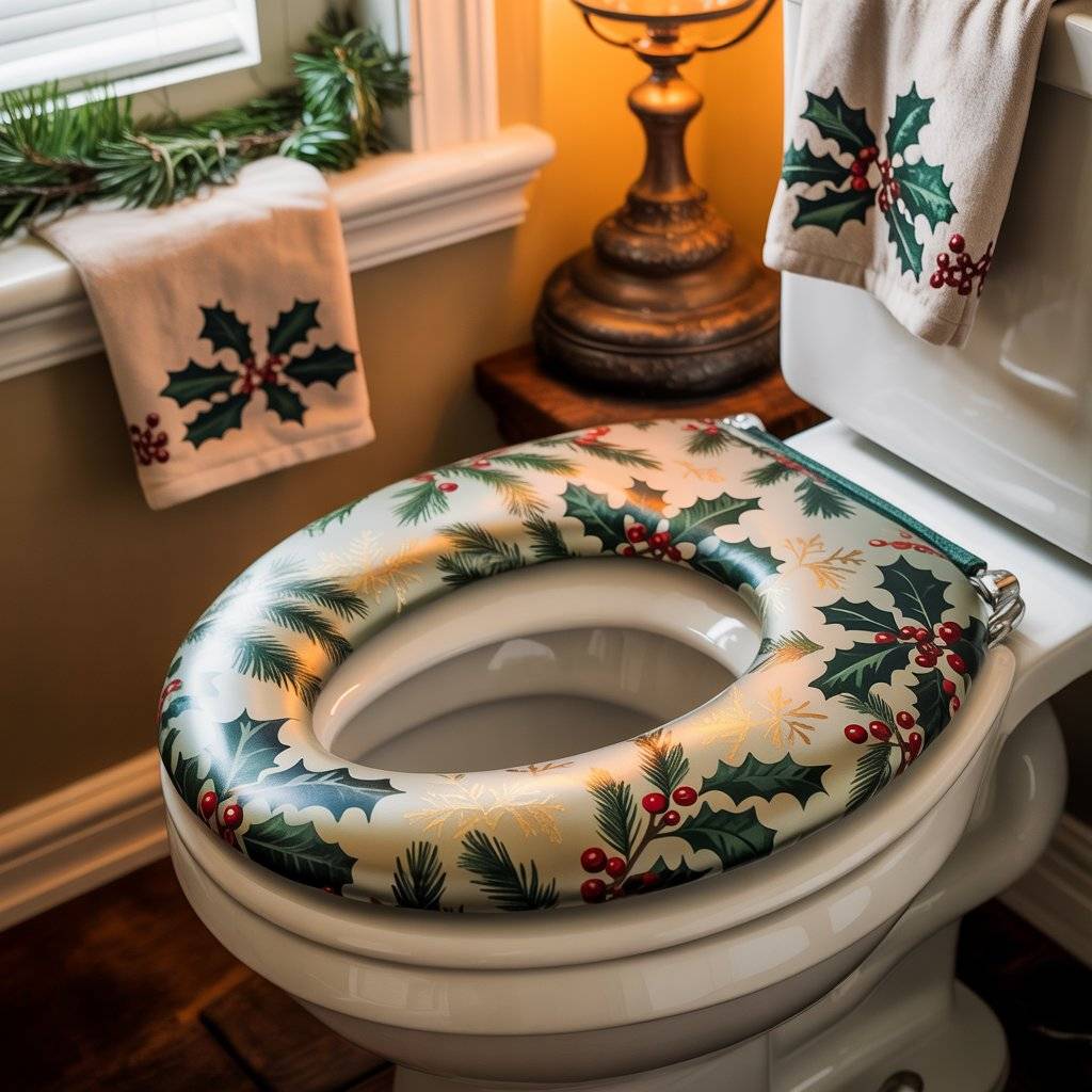 Even the smallest details can bring holiday cheer to your bathroom. A Christmas-themed toilet seat adds a playful yet cozy touch, turning an everyday fixture into a subtle festive accent. Think soft padded seats with muted red, green, or gold patterns, or embroidered designs like snowflakes or holly.