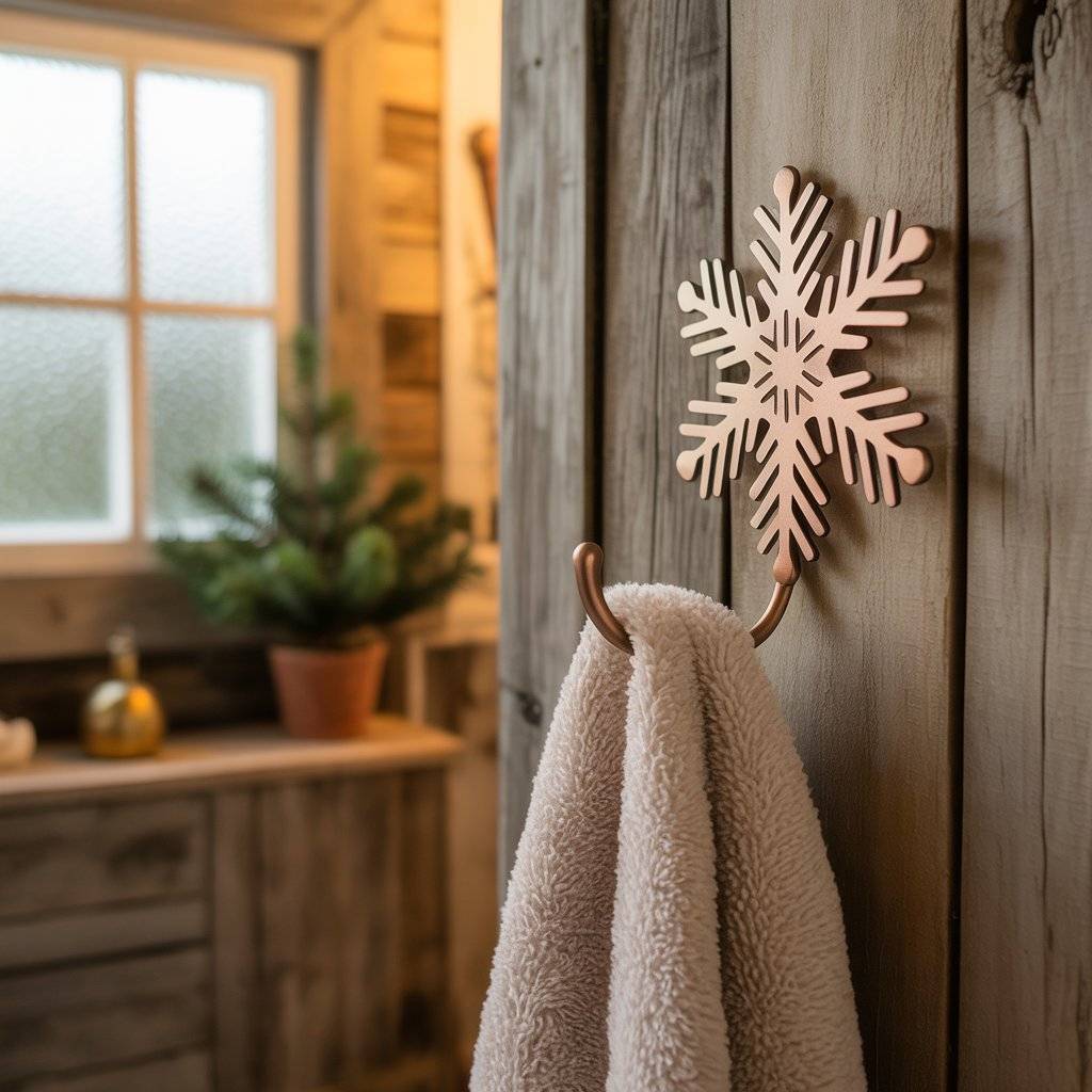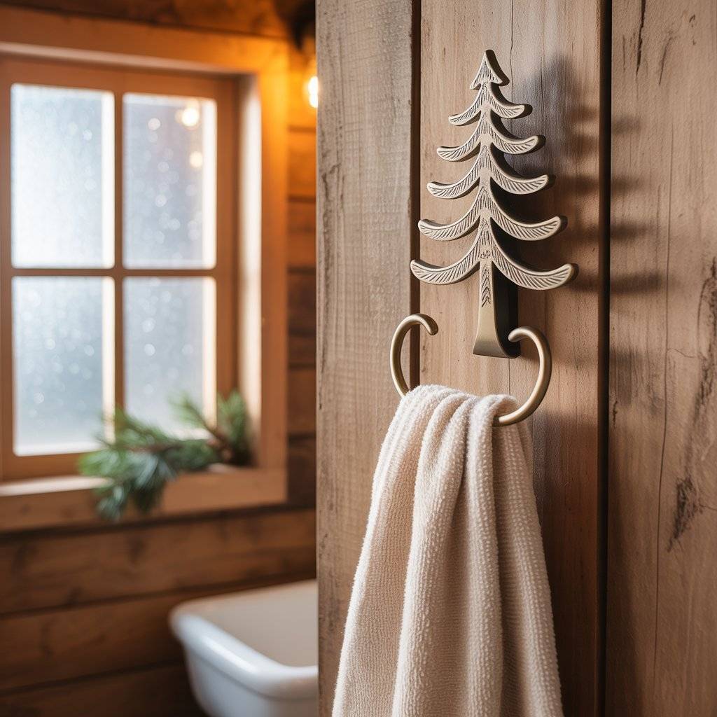 Even an outdoor or backyard bathroom can get a little holiday cheer. Swap a plain towel hook for a Christmas-inspired design think a tiny pine tree, star, or subtle snowflake. It’s a small upgrade that makes towels feel festive and the space instantly cozier.
