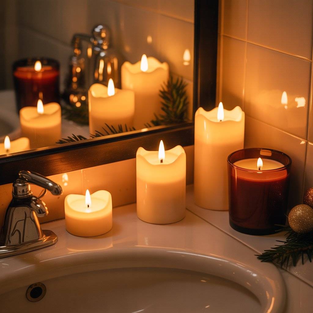 Candles instantly add cozy Christmas vibes, but in a bathroom, safety comes first. Pick a few battery-operated candles with warm, festive scents like cinnamon, vanilla, or pine.