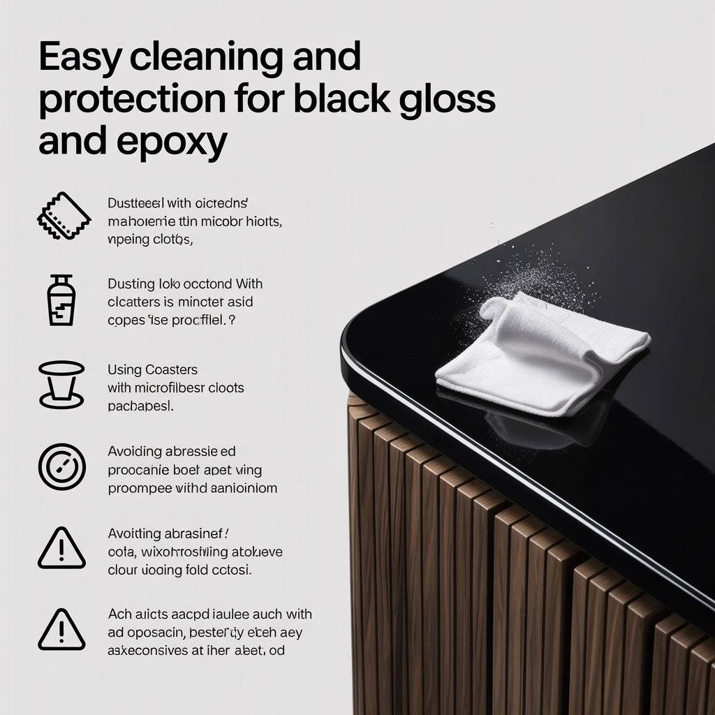 Your table is the star. The right chairs, lighting, and rug turn it into the whole show. A simple care routine keeps the black gloss and epoxy crisp.