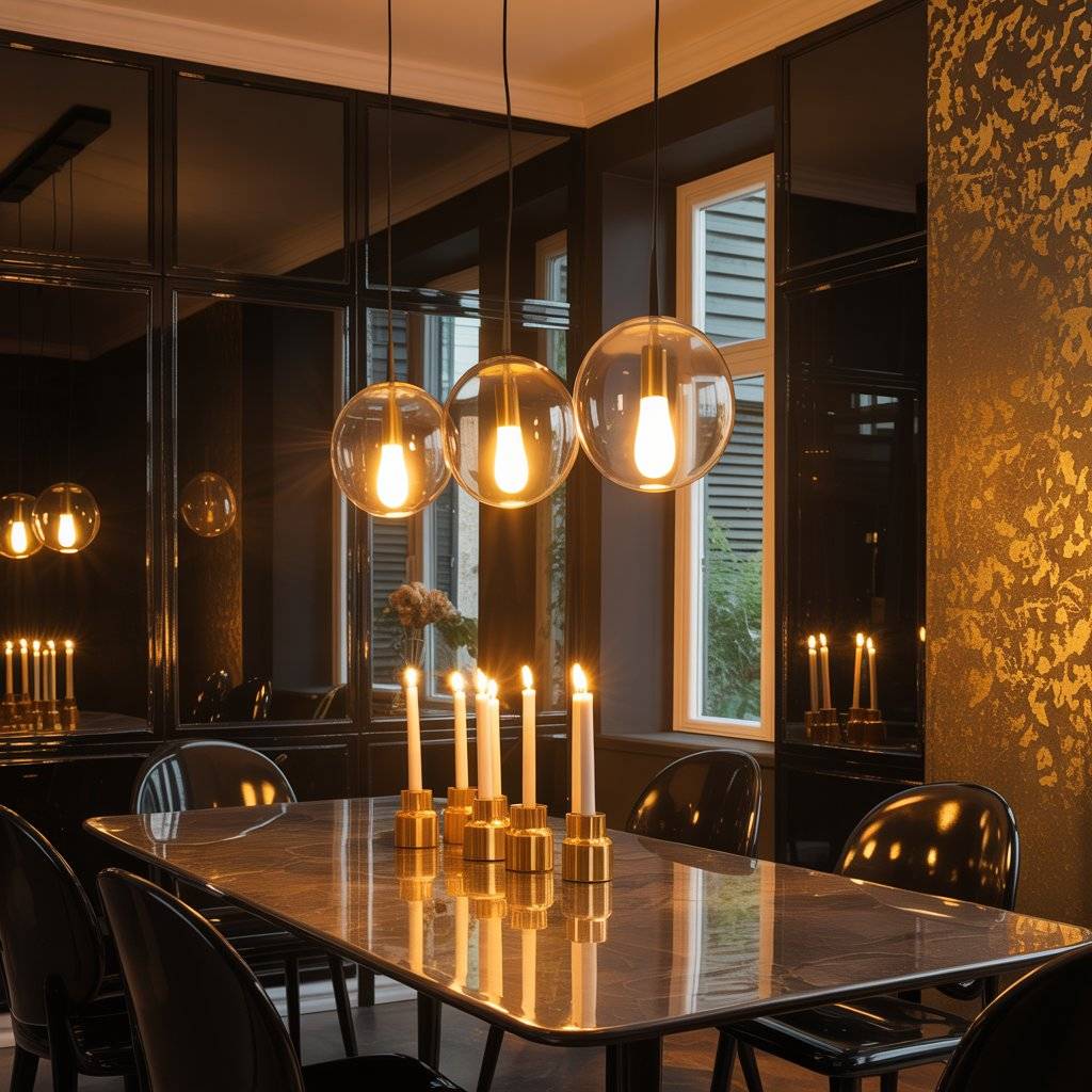 Gold flecks love warm light. Pendants and candles bring out a soft glow that feels cozy and luxe. Black gloss reflects windows and fixtures, which can make a space feel larger and brighter.