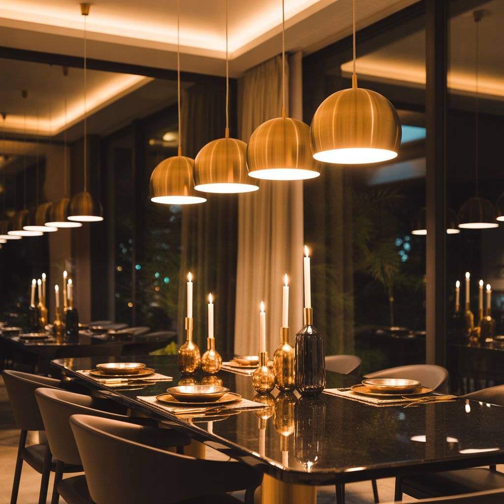 - Overhead lights: A chandelier or three‑globe pendant hung 30 to 36 inches above the top creates a warm pool of light.