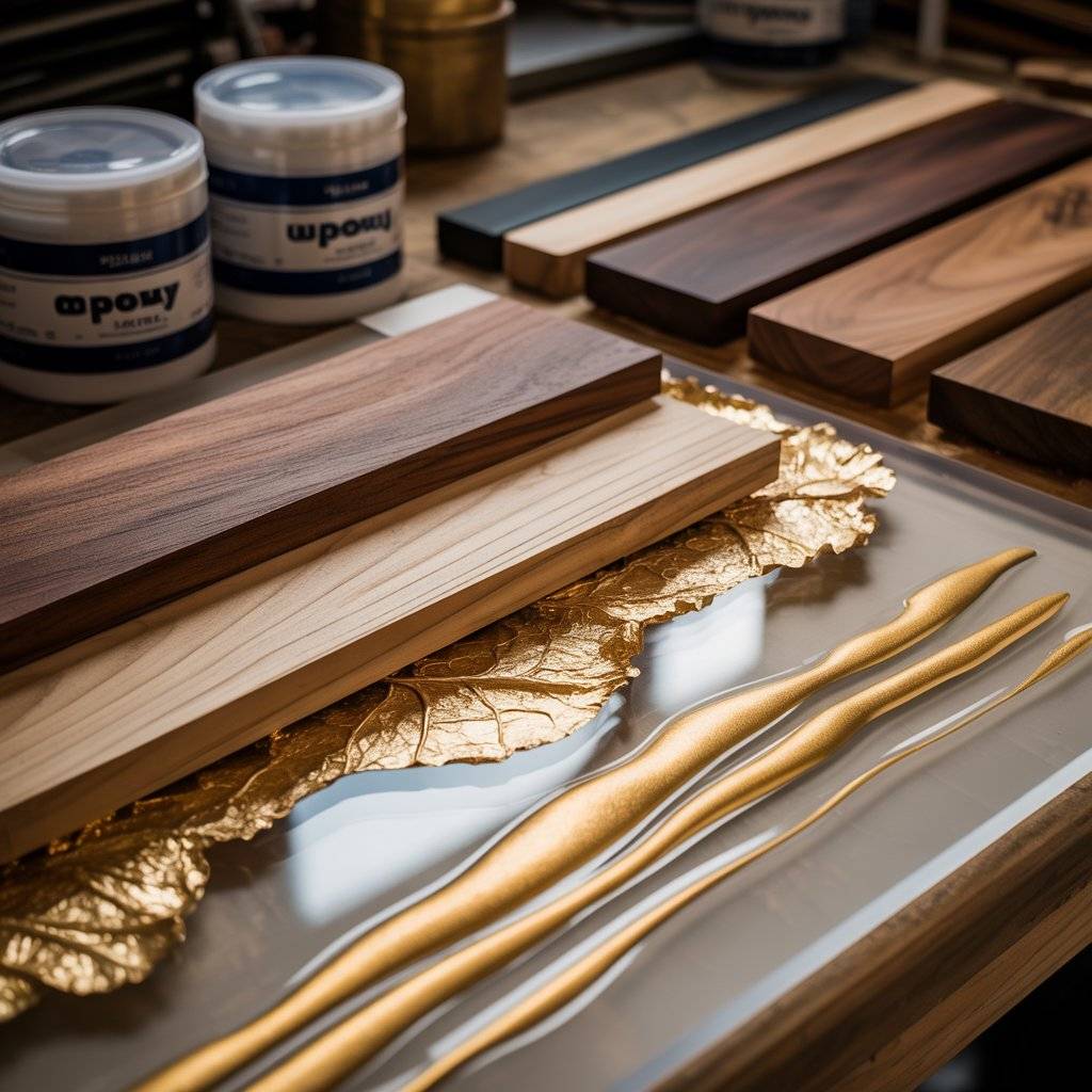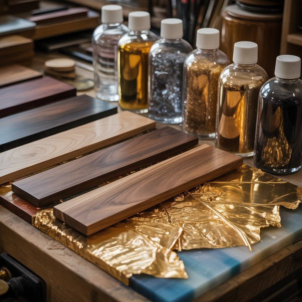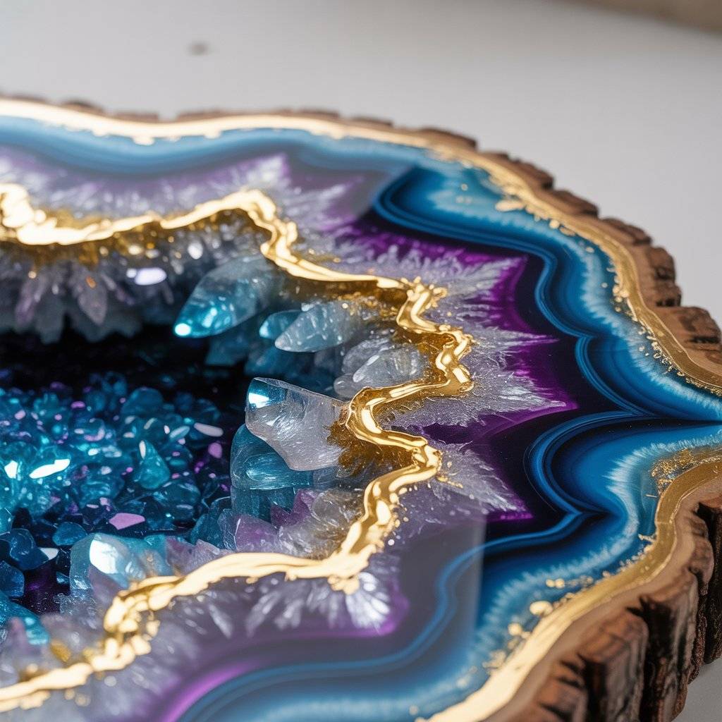 Epoxy resin is a clear liquid that cures into a hard, glassy surface. Makers use gold leaf, metallic powders, and tiny crystals or crushed glass to copy the look of a geode. Think of it like painting with light, then sealing it forever.