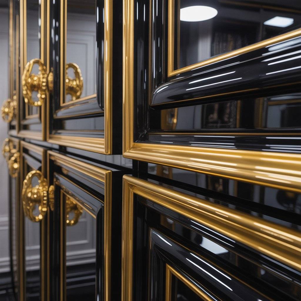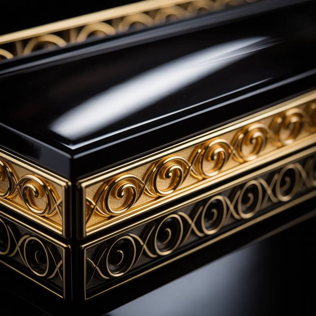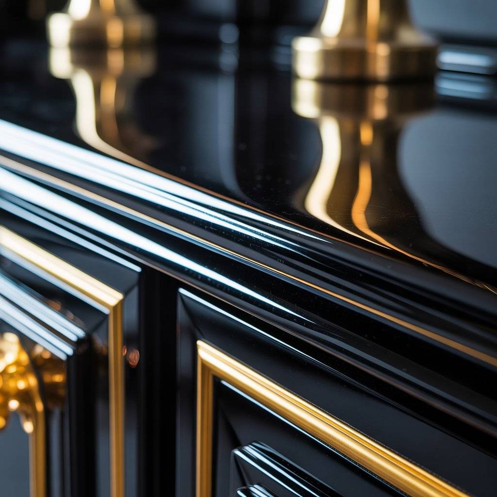 A black gloss finish looks like a grand piano top. It reflects light, handles sharp shadows, and makes the gold pop. That reflection creates a polished, gallery feel.