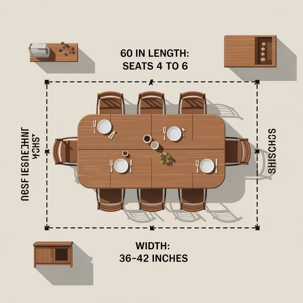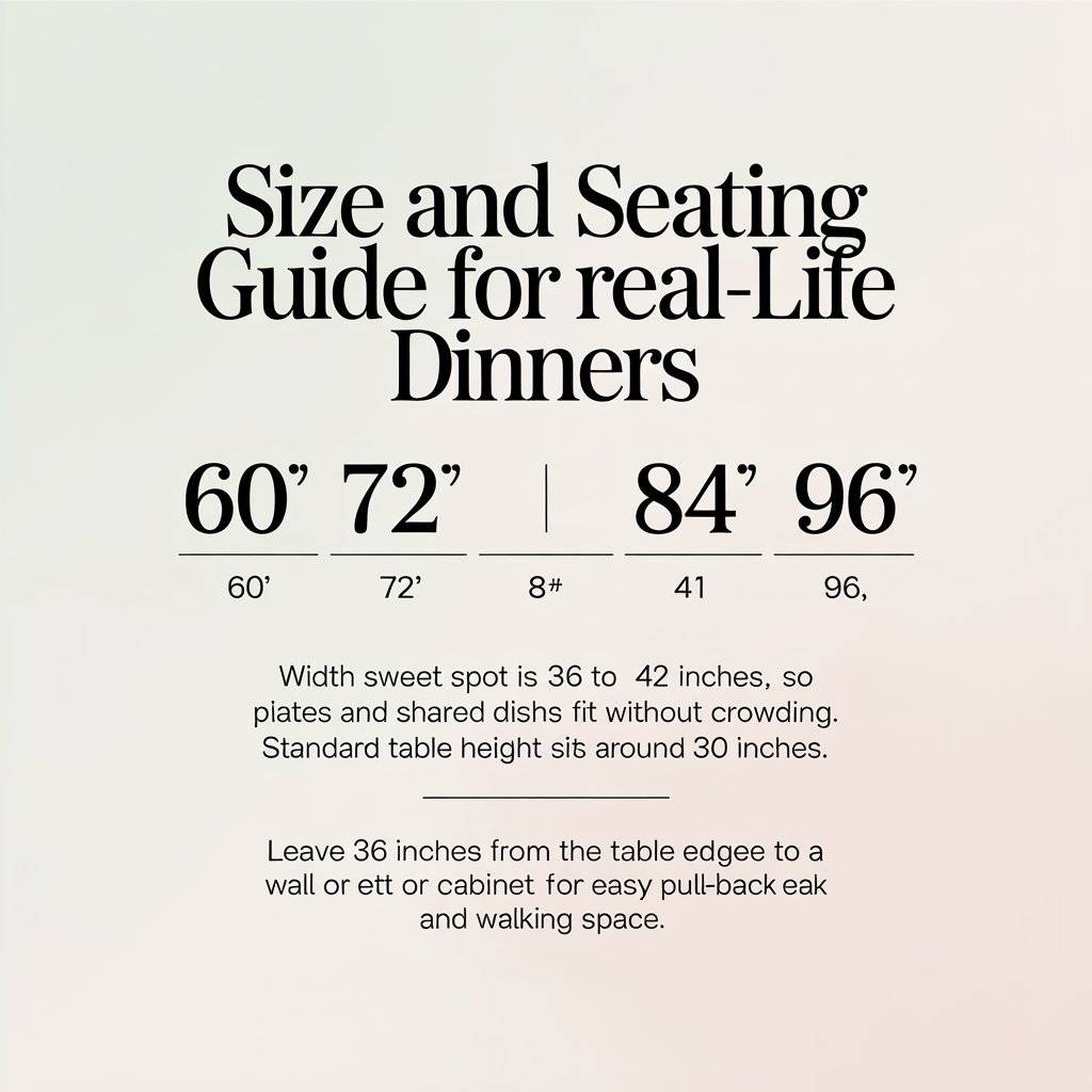 Width sweet spot is 36 to 42 inches, so plates and shared dishes fit without crowding. Standard table height sits around 30 inches.