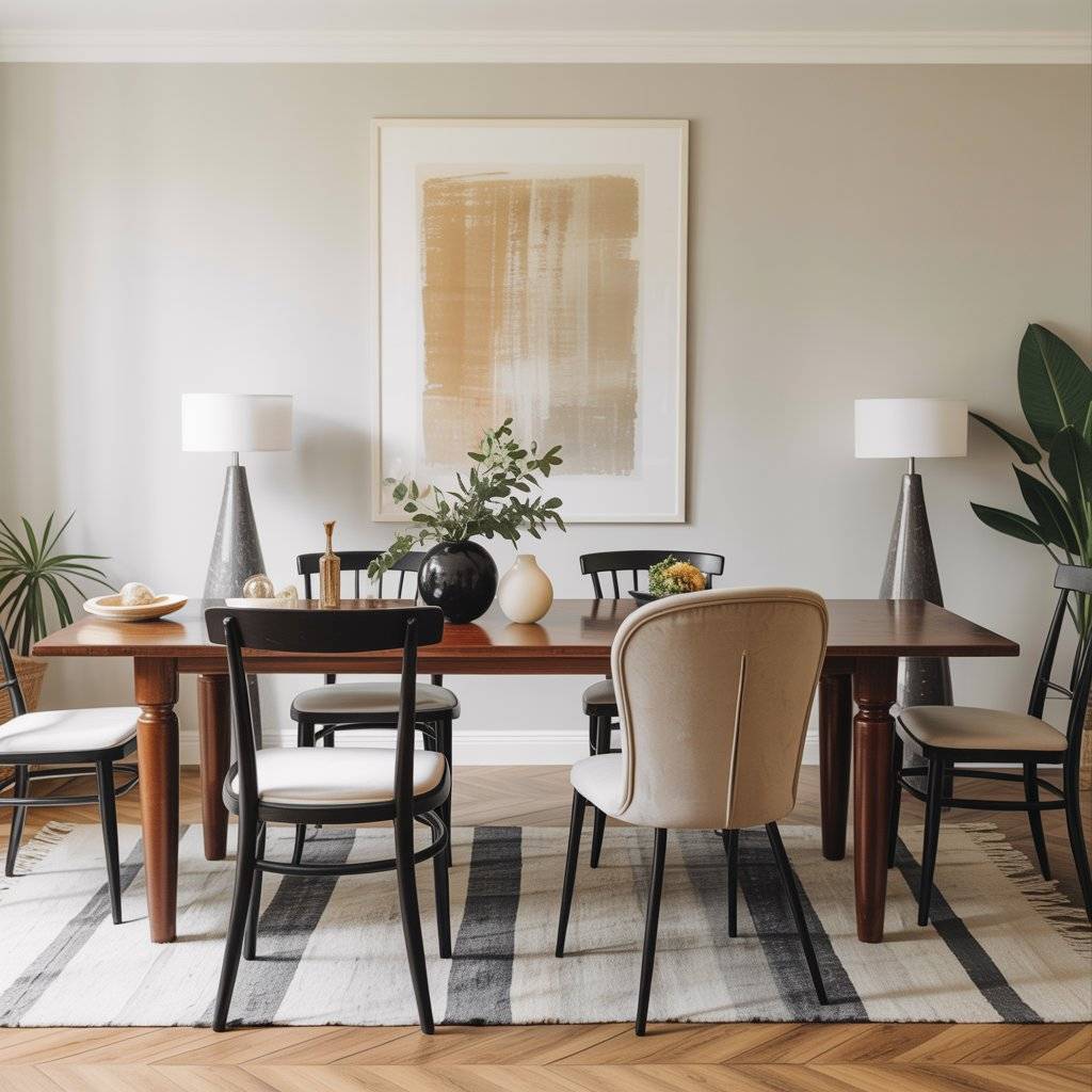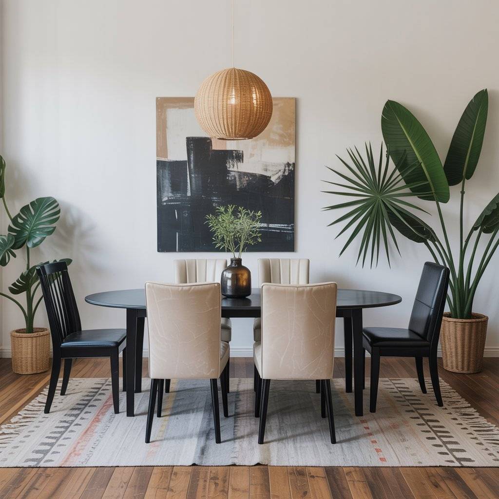 - Balanced chairs: Black or cream chairs keep the palette sharp. Velvet adds soft drama; leather brings structure and easy upkeep.