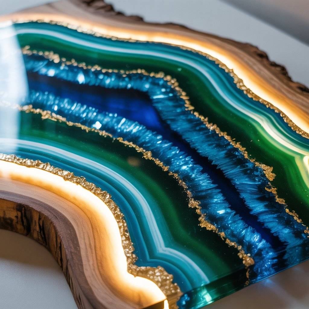 The magic comes from layers. Translucent resin sits over opaque veins, and soft gradients meet sharp metal glints. Light slips through the clear layers, bounces off the metallic bits, and returns with a warm glow. It feels like a slice of quartz or agate, only tailored to your room’s tone.