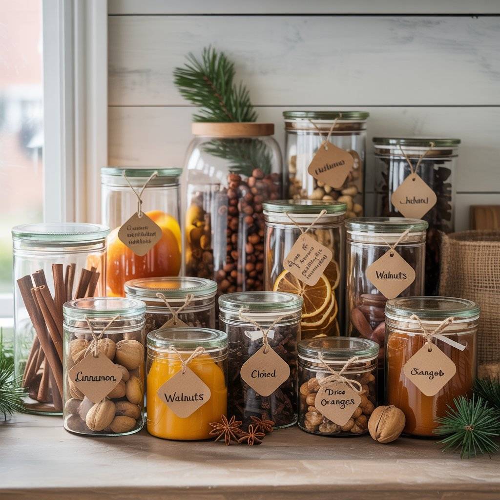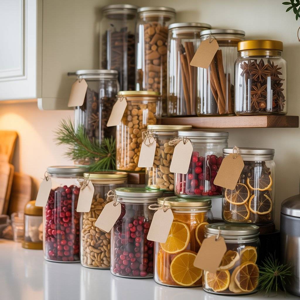 I like to take one wall, shelf, or section of the counter and create a large, coordinated display of jars and canisters. I swap out regular containers for ones filled with festive ingredients like cinnamon sticks, nuts, or dried oranges. Using jars of different heights and widths creates a layered, wide look that feels full without feeling cluttered.