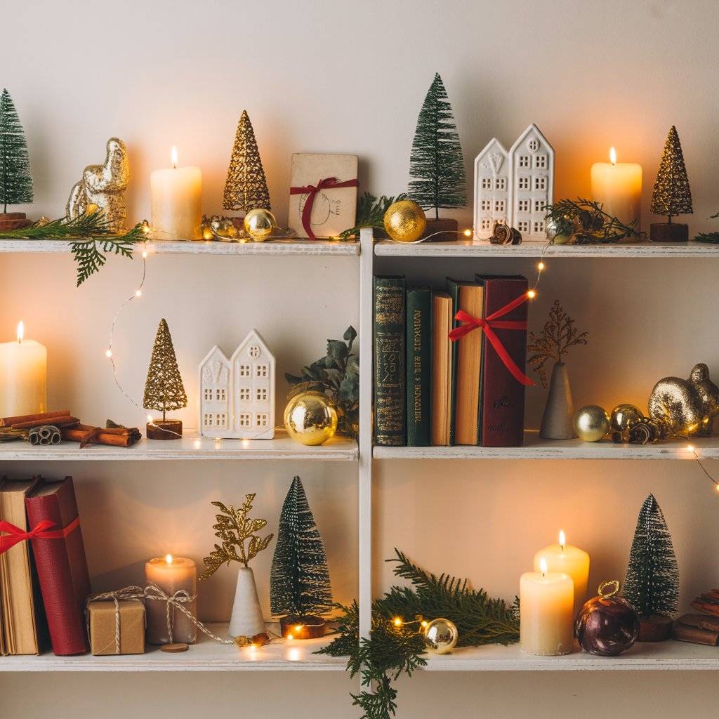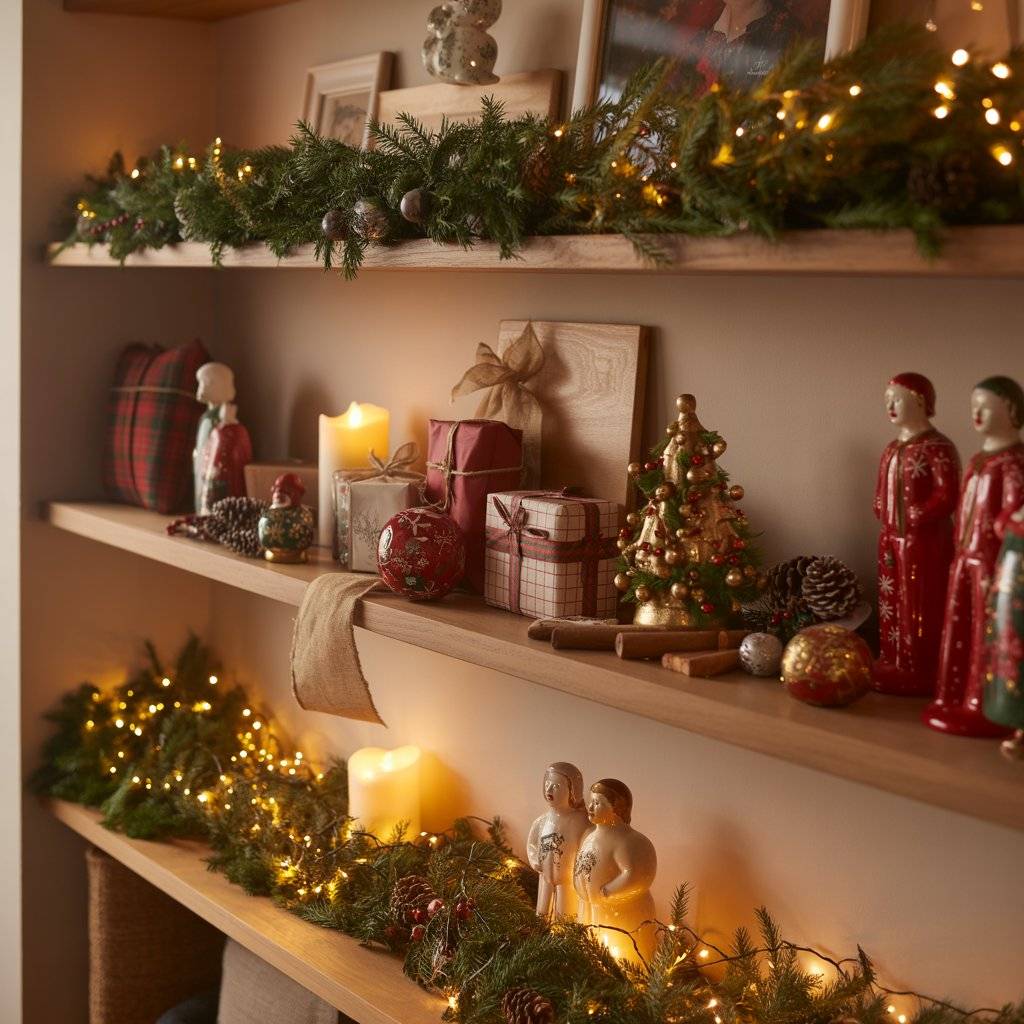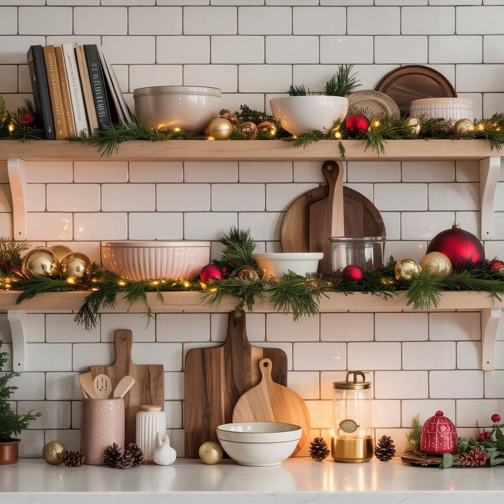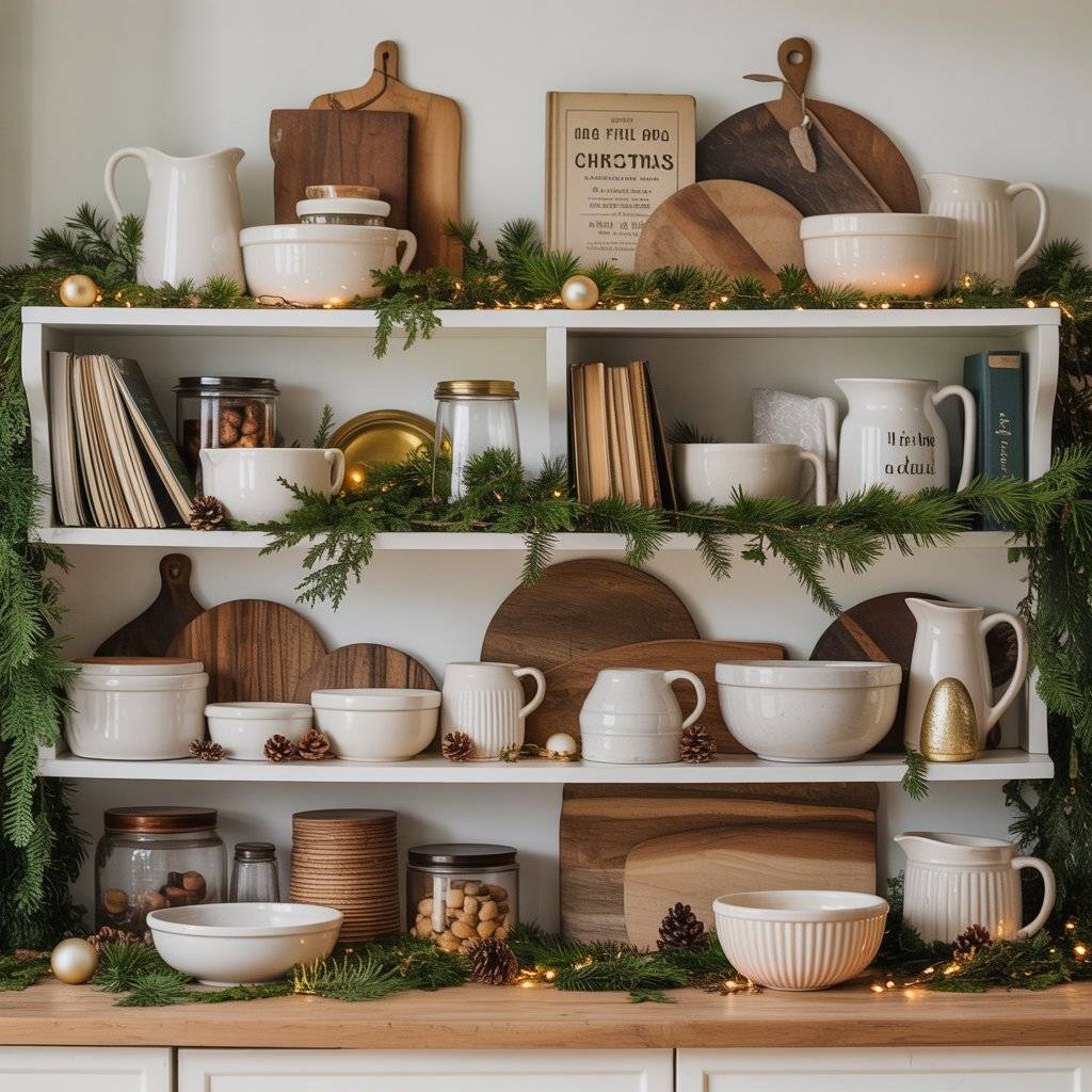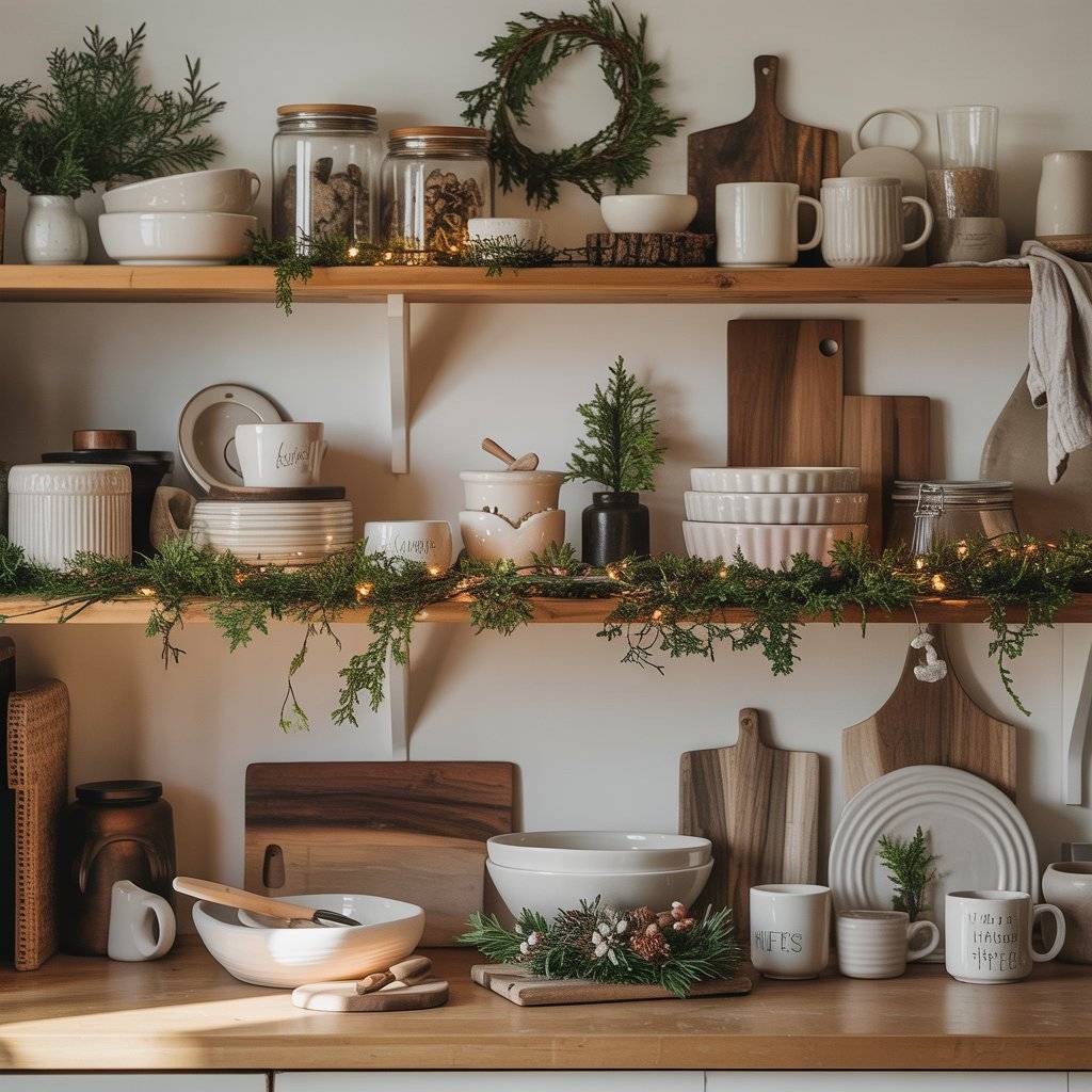 I start with warm woods, winter whites, ceramic bowls, and a few pieces of greenery to anchor the shelves. Then I add Christmas touches like a small wreath, winter mugs, or decorative storage jars.