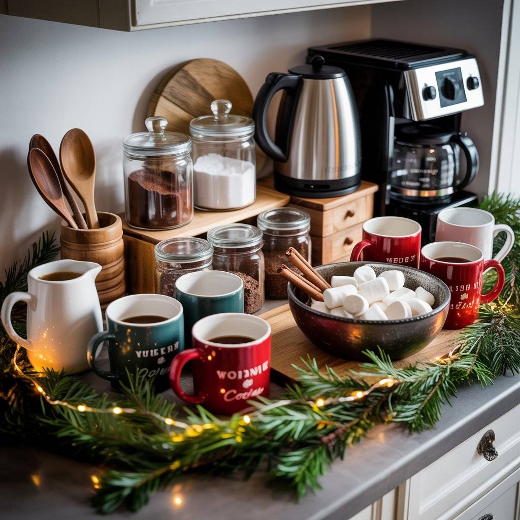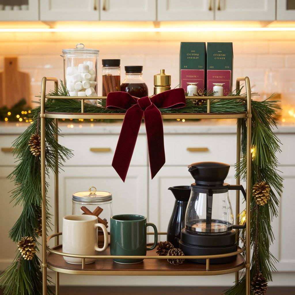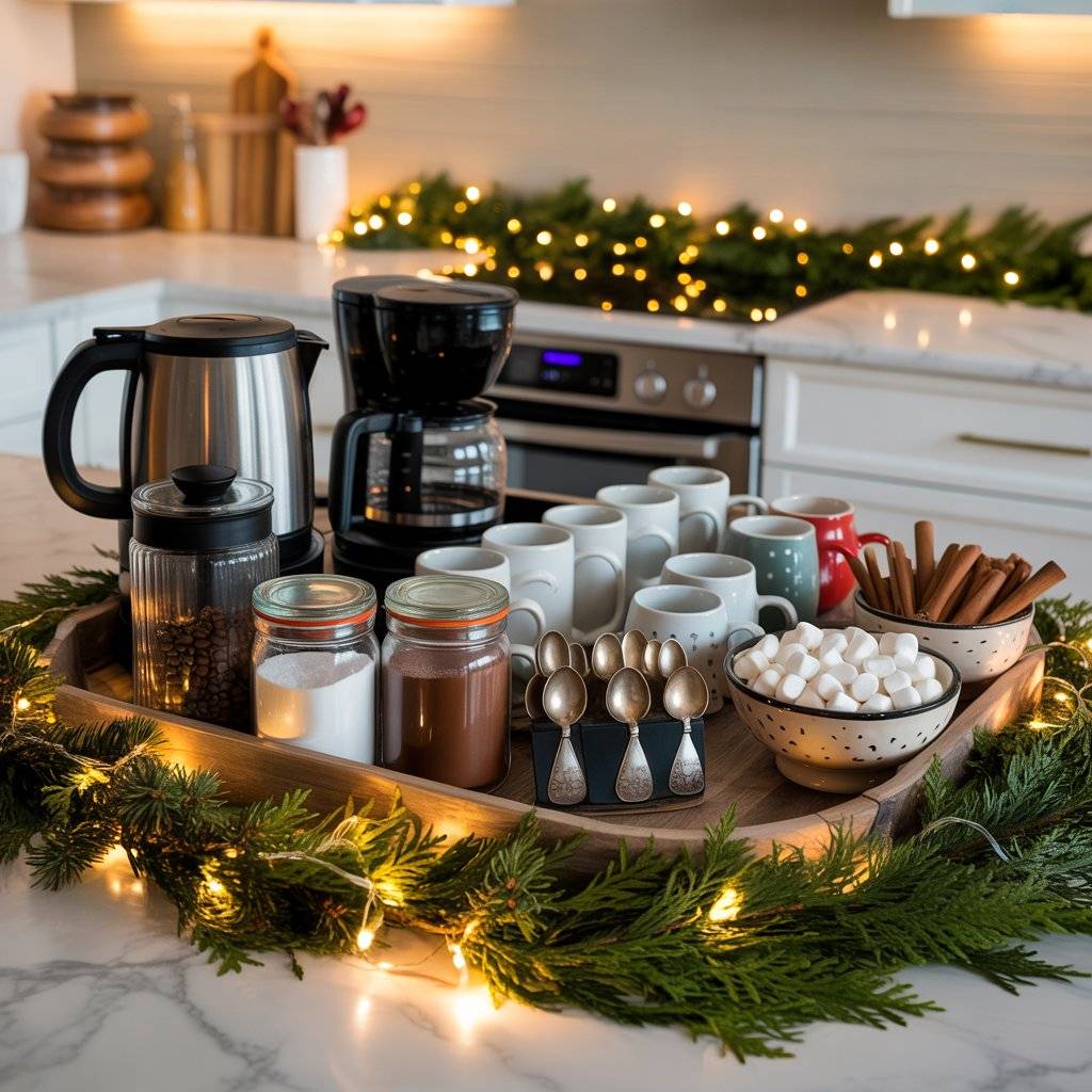 A modern Christmas kitchen feels even more welcoming when you create a big drink station coffee, tea, hot chocolate, everything in one place. I choose a wide section of the counter or a side cabinet and fill it with items I actually use every morning: mugs, jars for sugar and cocoa, spoons, and a kettle or coffee maker.
