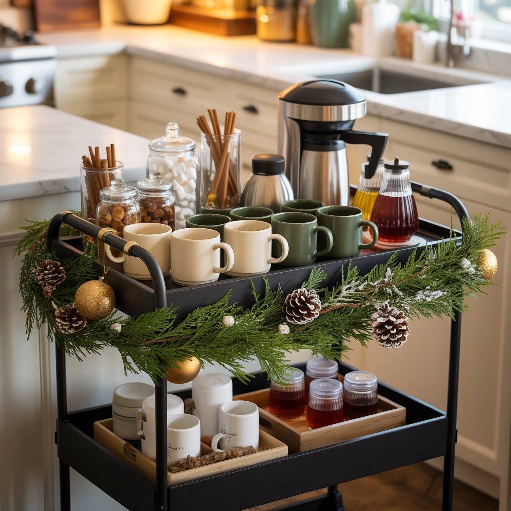 This makes the station both practical and decorative. It’s easy to refill and easy for guests or family members to use. A wide, fully stocked beverage station becomes a focal point in the kitchen, giving it a festive, modern, and functional feel. It’s one of those upgrades that looks like a complete seasonal transformation without taking up the main workspace.