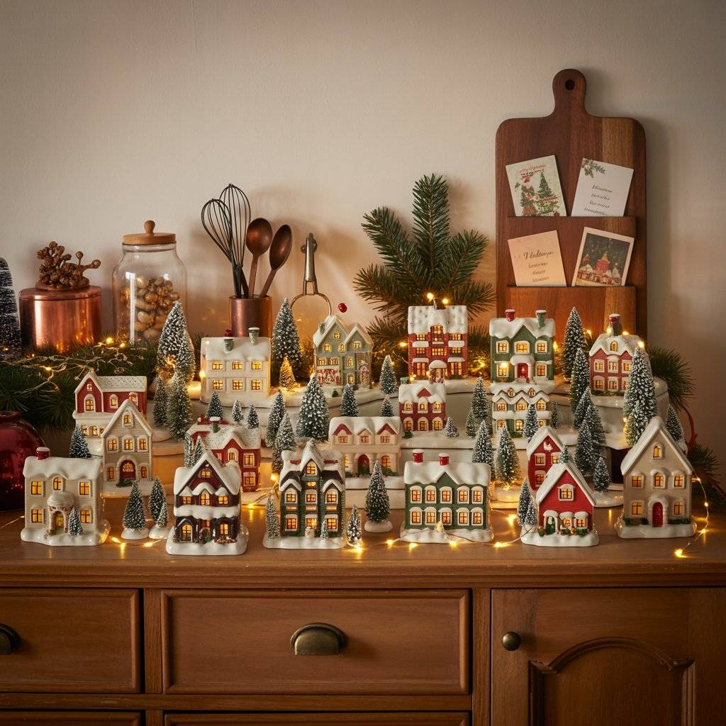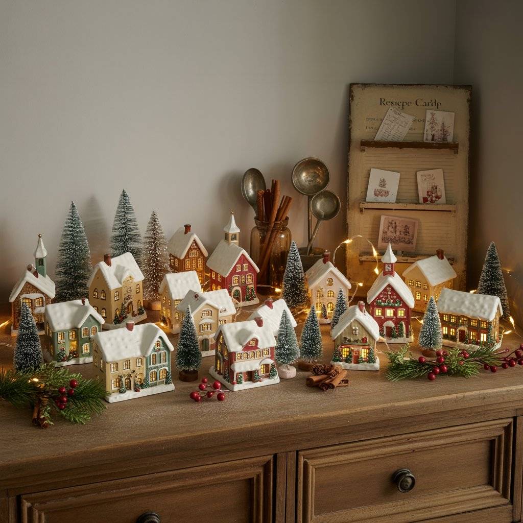 If you have a side counter, hutch, or rarely used surface, create a wide holiday village. Use a mix of vintage-style or ceramic houses, mini trees, and soft LED lights. This village becomes a decorative “scene” that’s not just ornaments it functions as a holiday installation.