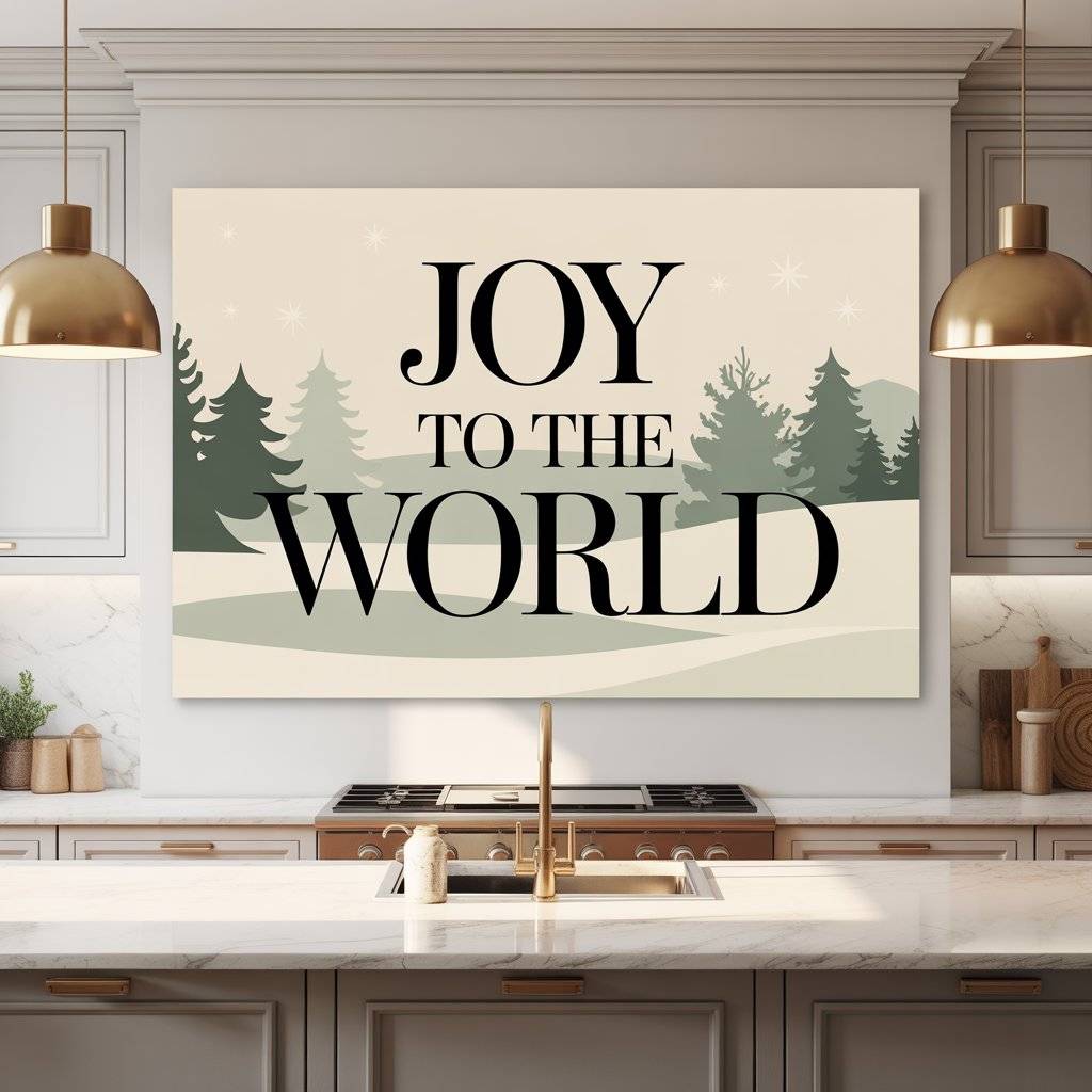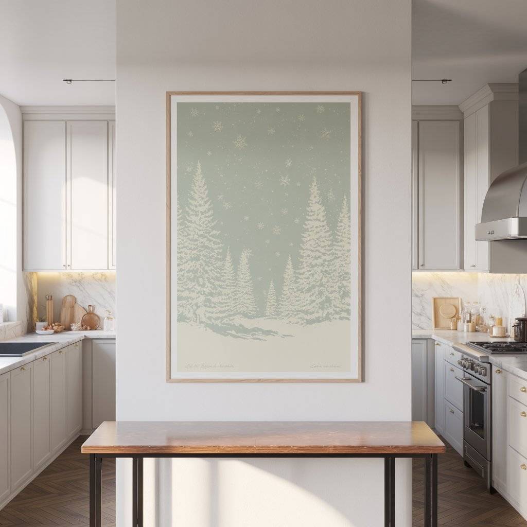 Most kitchens have at least one wall that feels empty or forgotten. During Christmas, I like to use that spot to hang one large seasonal print or framed Christmas artwork. The key is to choose something big enough to anchor the wall not small pieces that get lost. A modern winter print, a simple Christmas word poster, or a subtle holiday landscape works perfectly.