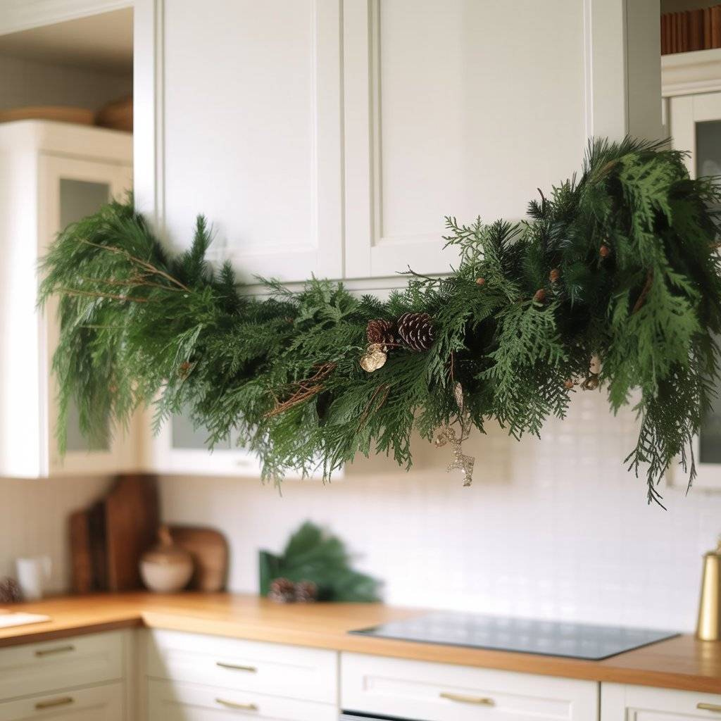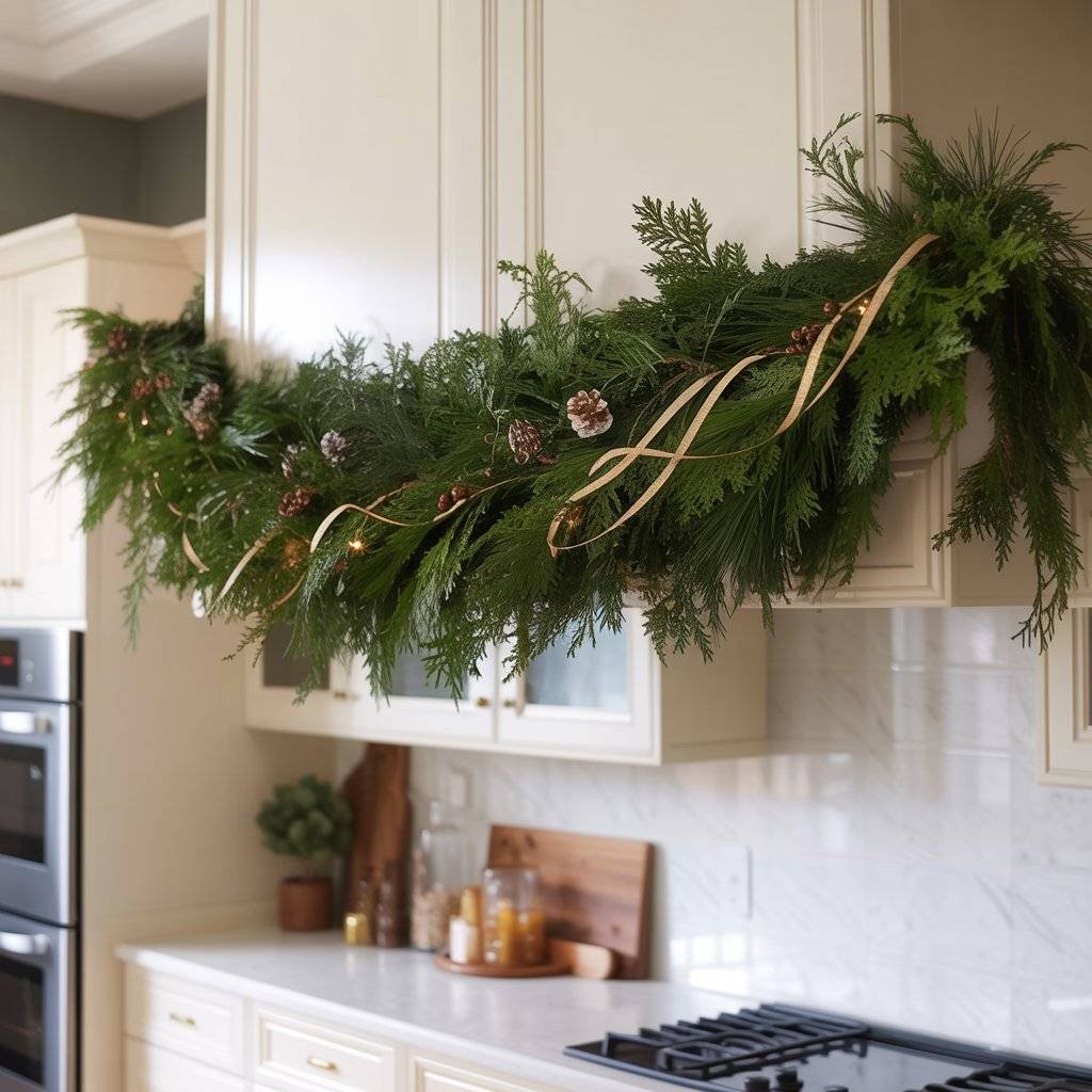 5. Add a Wide Christmas Garland Above Your Cabinet Line