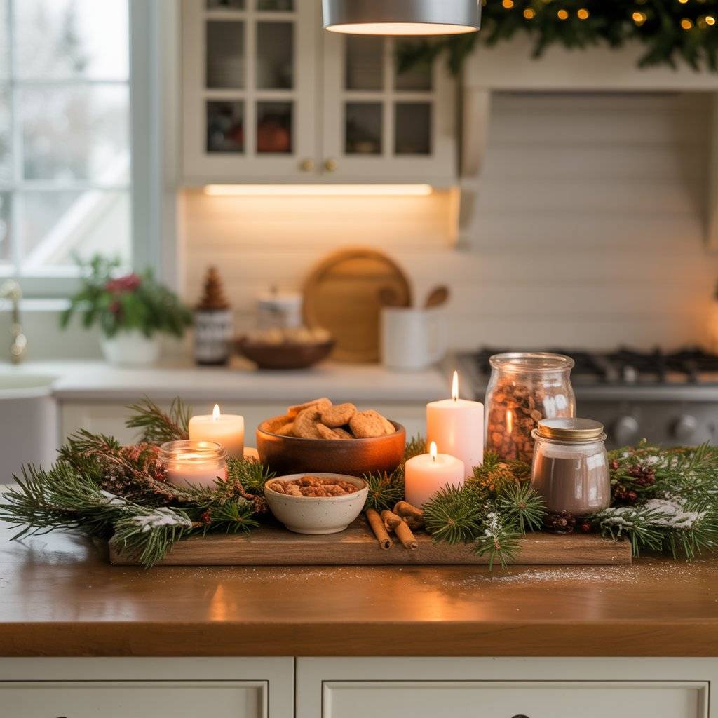 Focus on wide, intentional pieces like large trays, cutting boards, or a seasonal runner. Use decor that doubles as functional storage or prep stations. This way, your kitchen feels festive but stays practical for cooking and baking.
