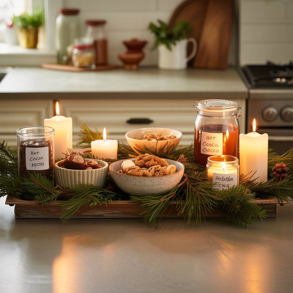 This setup works because it fills the visual space without taking up usable counter area for cooking. I make sure the items are easy to move when I need the space, and I use things I already interact withlike a bowl for snacks, jars of cocoa, or a candle I light in the evening. This approach makes the kitchen feel cozy, festive, and intentional while staying fully functional.