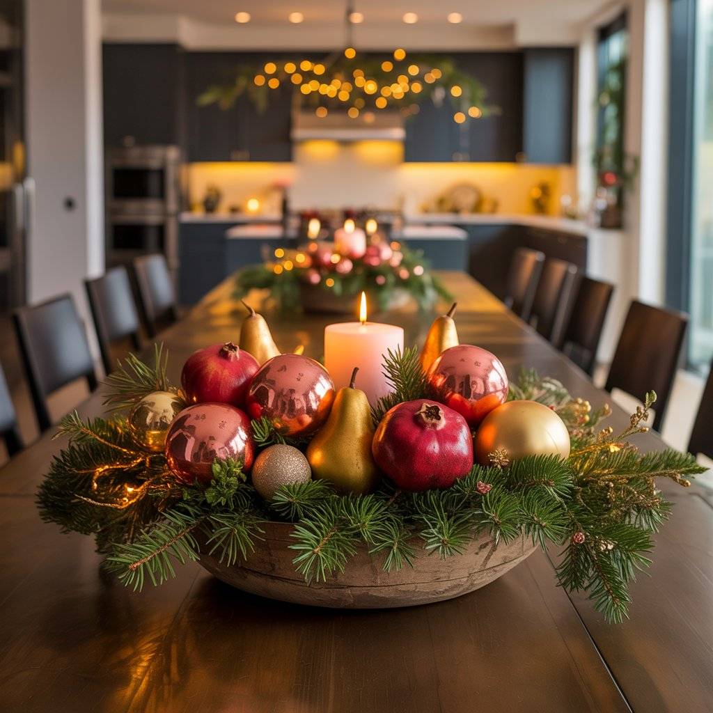 If your kitchen opens into a dining space, adding one strong Christmas centerpiece can completely change how the whole room feels. I usually choose something large and grounded, like a long wooden bowl filled with pine branches, oversized ornaments, or winter fruits like pears and pomegranates. This creates a full look that feels intentional, not scattered.