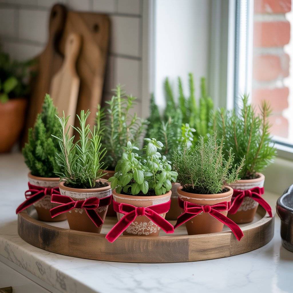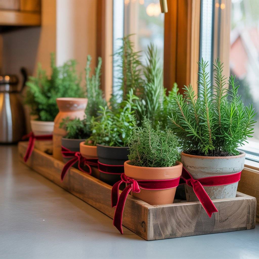 Turn part of your kitchen into a live holiday garden. Use small pots or a long planter box and plant evergreen herbs like rosemary, thyme, or small pine sprigs. Not only do they look seasonal, but you can also use the herbs while you cook.