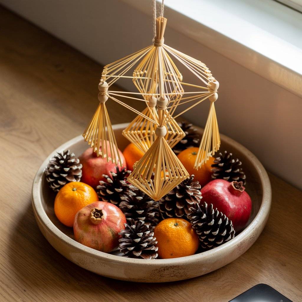 Bring the straw mobile idea down to countertop height: get a smaller himmeli (in brass or natural straw) and set it inside a wide wooden or ceramic bowl. Surround it with pinecones, seasonal fruit (like oranges or pomegranates), or faux snow.