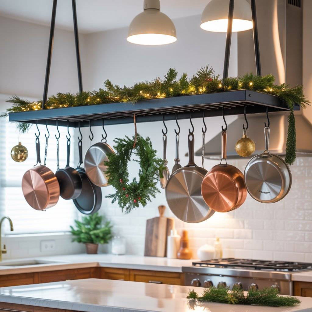 If your kitchen has space above the island or stove, a large pot rack is a game-changer for Christmas. I like to use it not just for pots and pans, but also to hang seasonal touches like a small wreath, strings of greenery, or a few lightweight ornaments. The rack stretches across the space, instantly giving the kitchen a full, festive feel.