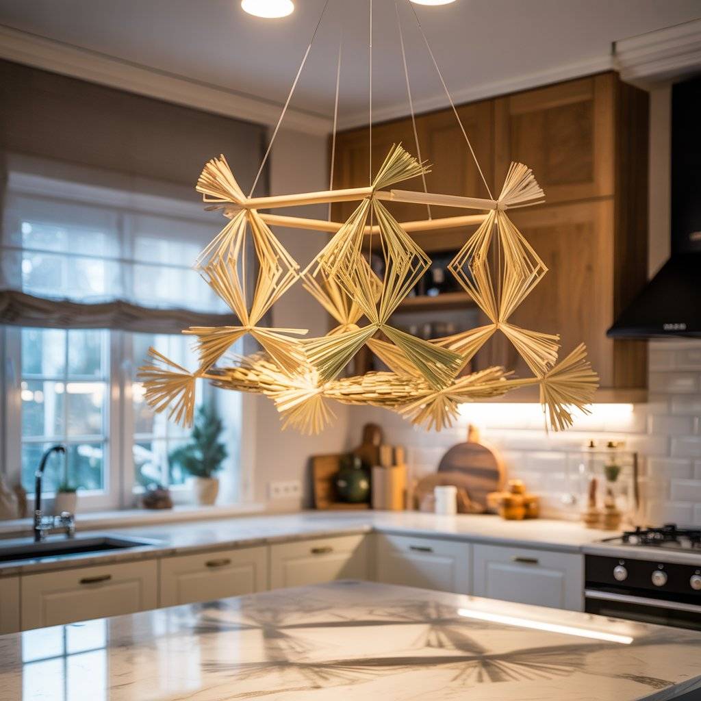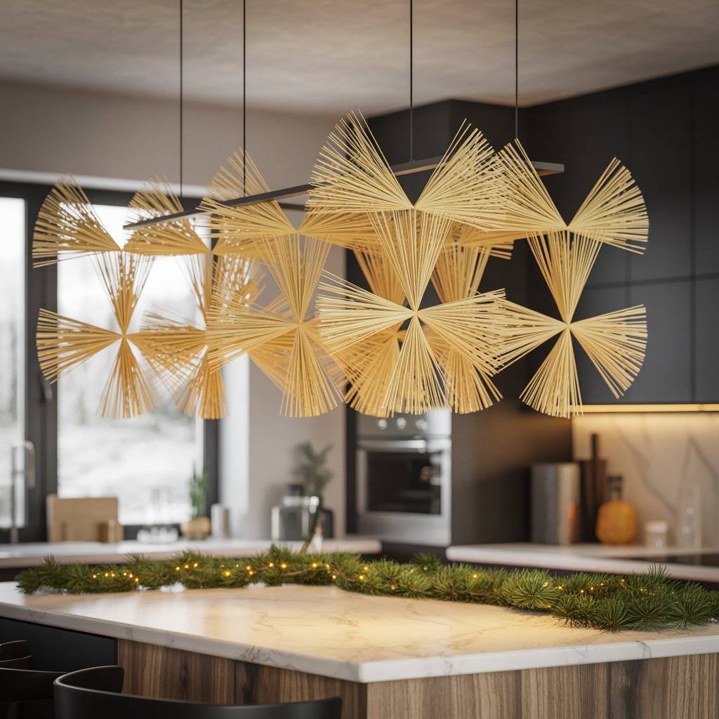 Instead of typical garlands or lights, hang a straw mobile (also called a himmeli) above your kitchen island. These geometric mobiles made from straw or metal create a sculptural, Scandinavian-inspired decoration that gives height and visual interest.
