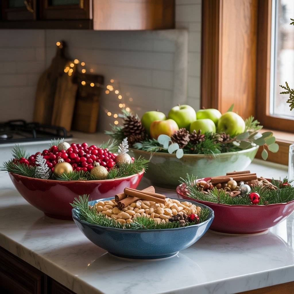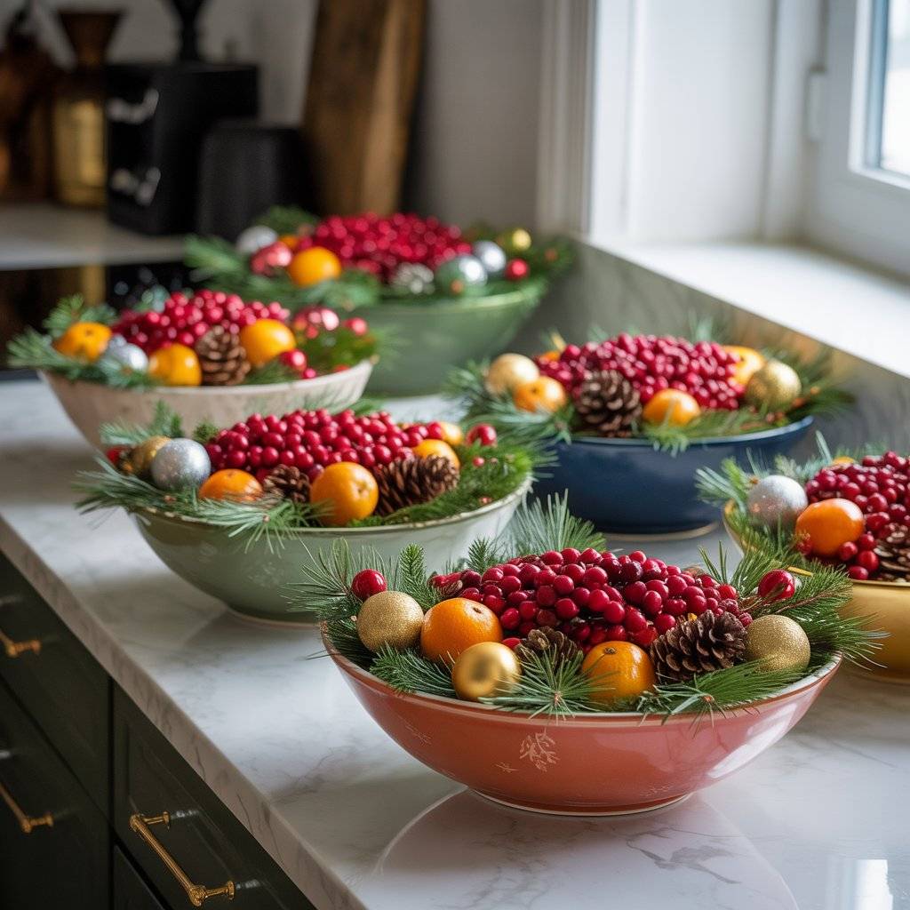 I like to take large serving bowls that I actually use and make them feel festive for Christmas. I layer them with fresh fruit, pinecones, greenery, or small ornaments to create a wide display that fills the counter space.