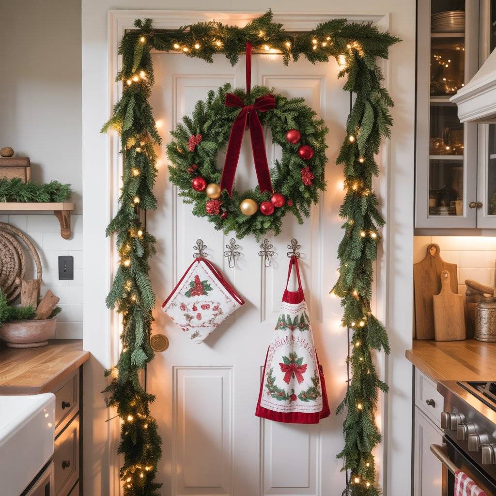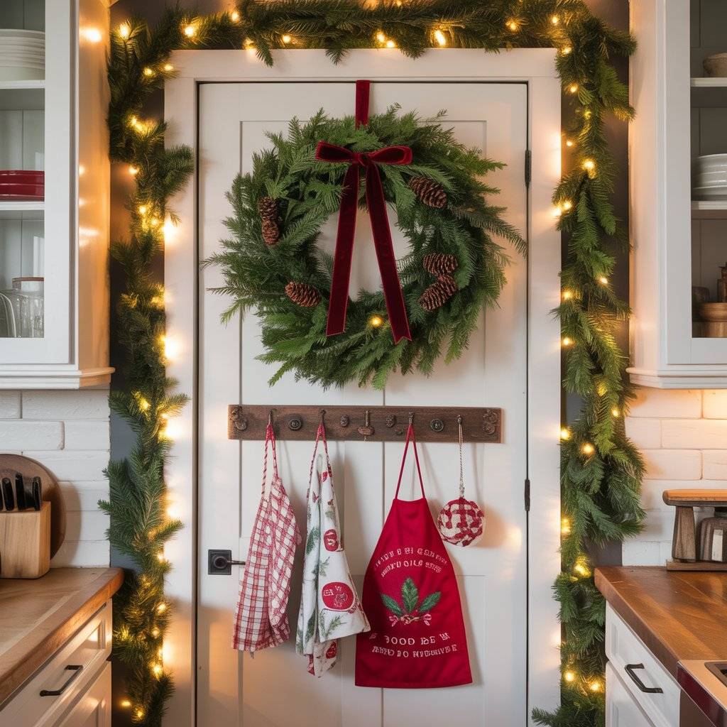 If your pantry or closet door is visible, I turn it into a large, functional holiday focal point. I hang a full, wide wreath, attach a garland along the frame, or add a few hooks for festive towels and aprons. This instantly makes the space feel bigger and more seasonal.