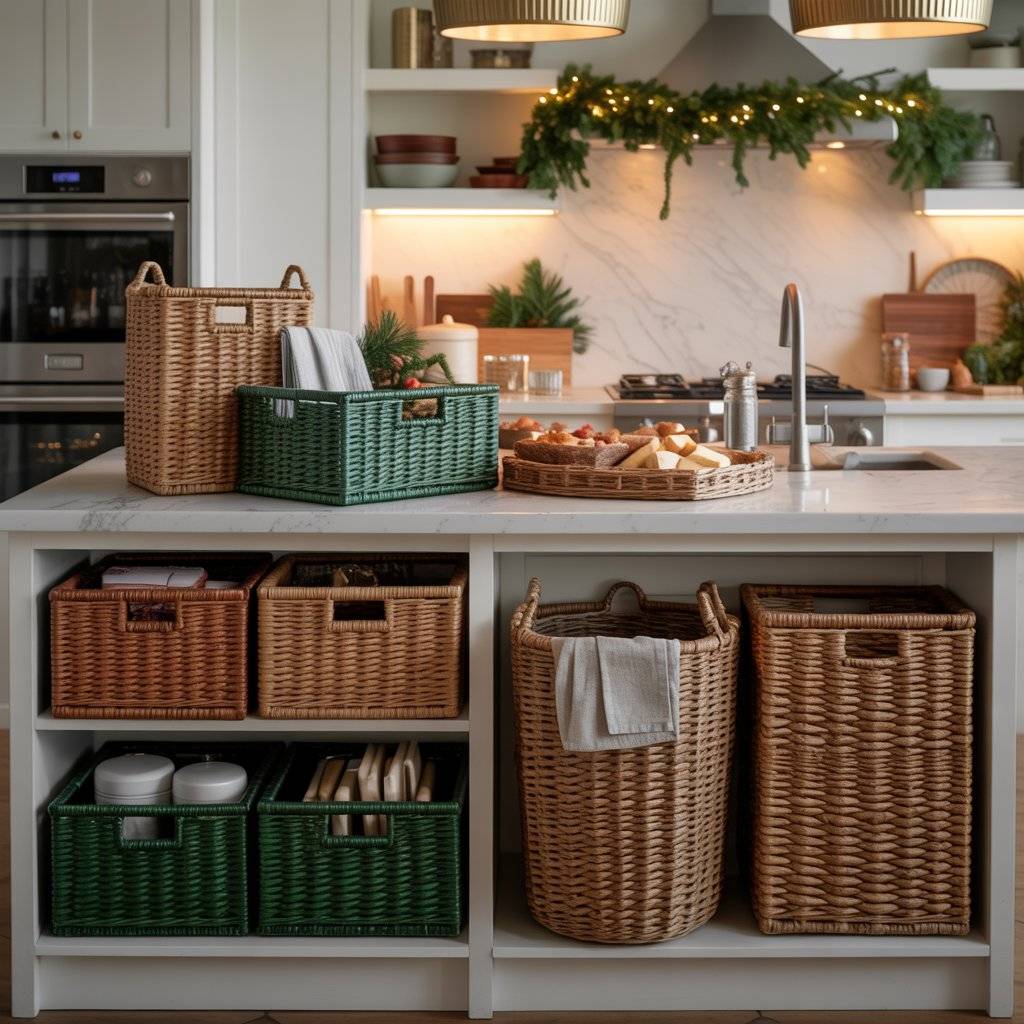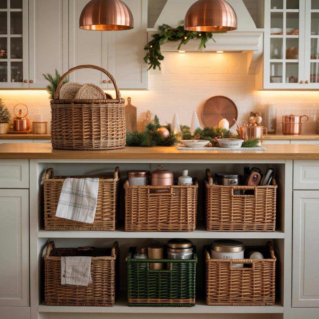 One of the most useful Christmas kitchen updates I make is switching some of my everyday storage to larger woven baskets. These aren’t just for holding things they bring warmth, texture, and a winter feel to the kitchen. I place them on open shelves or under the island to store things I use more during the holidays: extra kitchen towels, baking supplies, or snacks for guests.