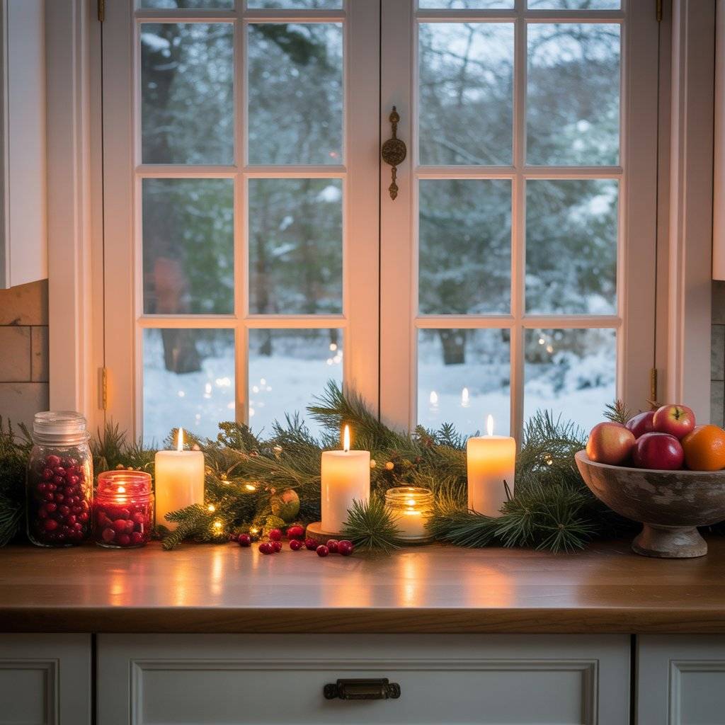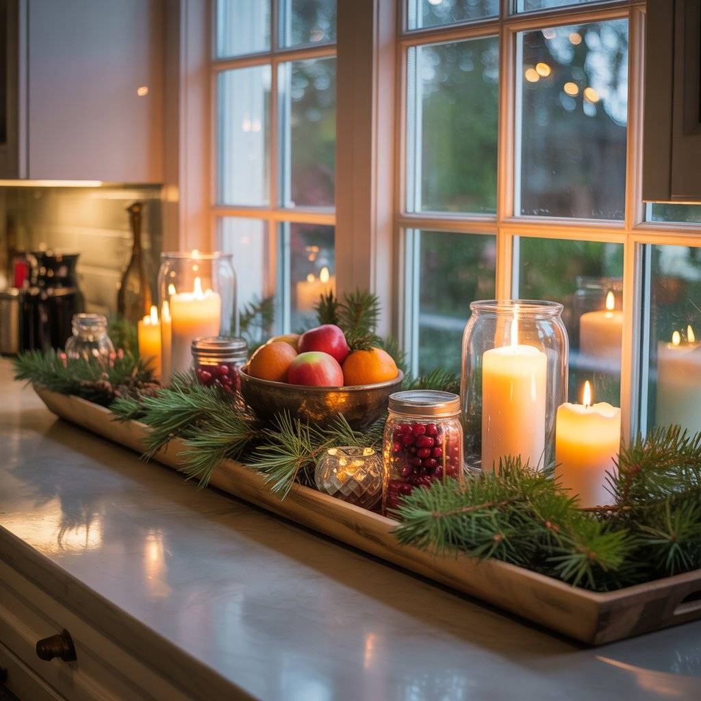 If your kitchen has a visible window, I turn it into a big holiday feature. I like to place a long wooden or metal tray along the sill and fill it with seasonal item spine branches, candles, or even a few decorative jars. If the window is wide, I make sure the arrangement stretches across most of it to create a cohesive, full look.