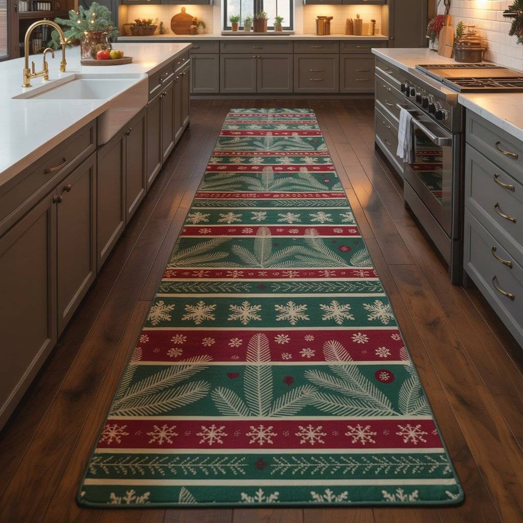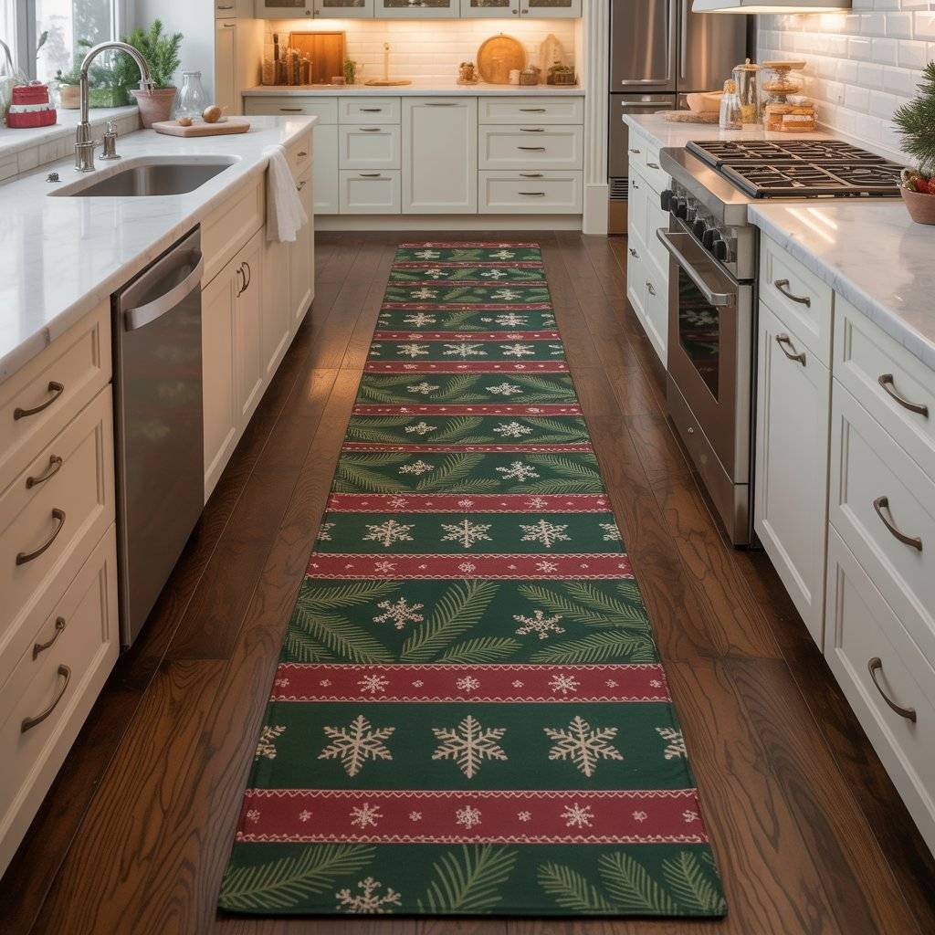 A long, modern runner can completely change the feel of your kitchen during Christmas. I like to choose a runner with warm tones deep greens, soft reds, creams, or simple winter patterns. The length makes the whole room feel bigger and more connected, stretching from the sink area to the prep zone.
