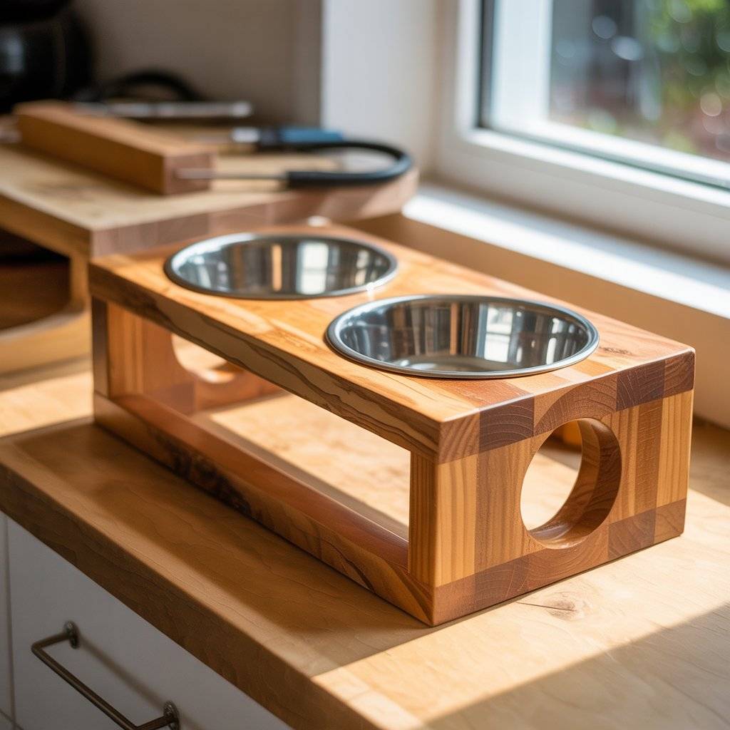 Use solid wood or reclaimed timber for a natural, modern look, and seal it with pet-safe finishes. Add metal or ceramic bowls to complete the design. It’s sustainable, affordable, and adds a handmade touch to your home.