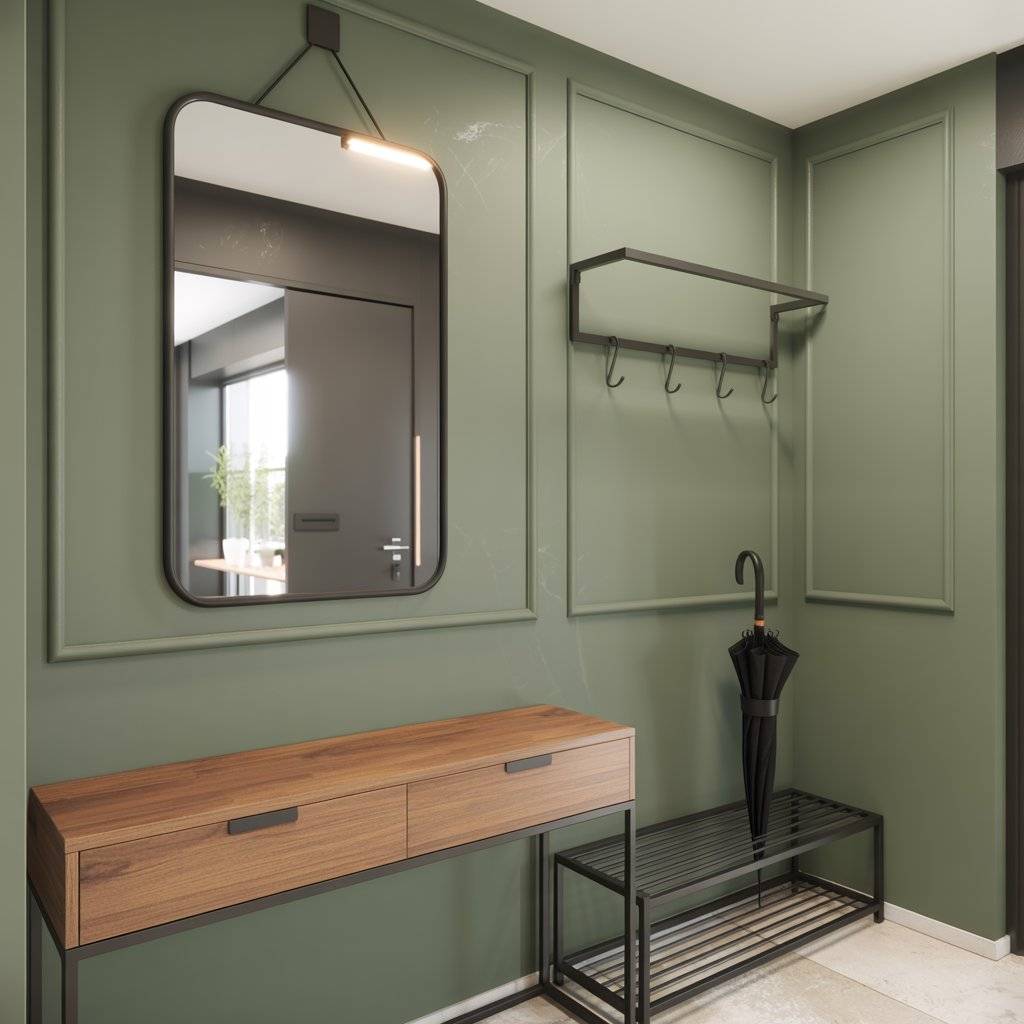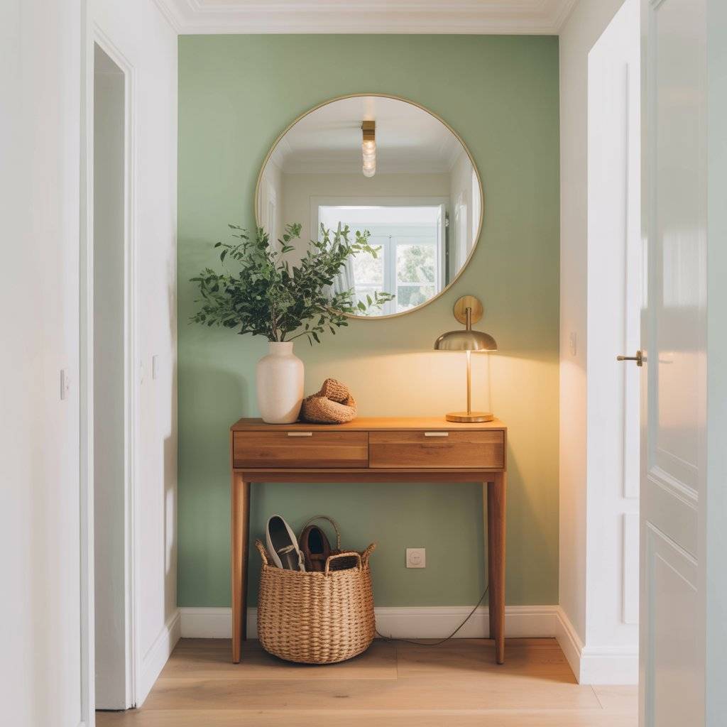 For example, a sage green wall behind a black-framed mirror creates a clean focal point. Add a wooden console table underneath, and the entryway immediately feels balanced.