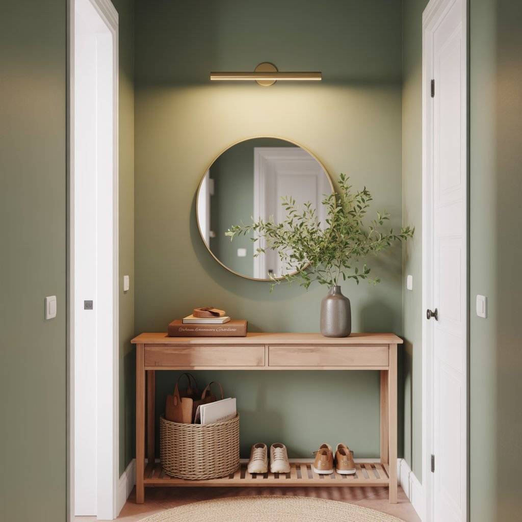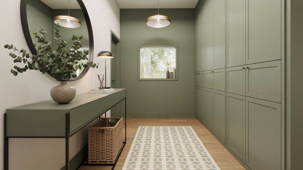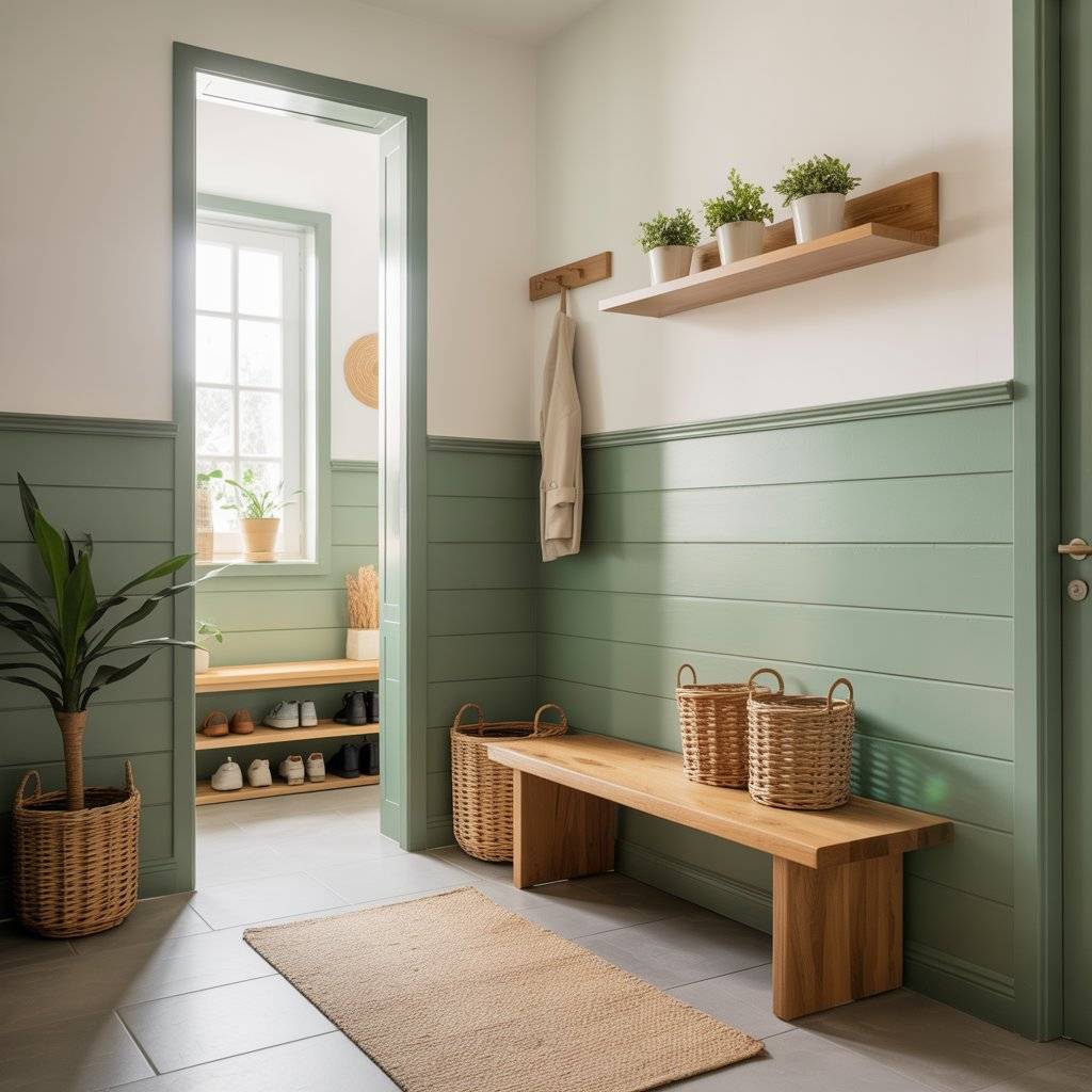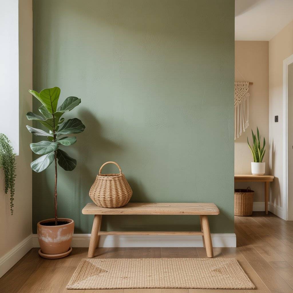 I’ve seen beautiful entryways where a sage green wall sits behind a small wooden bench and a few potted plants. The combination creates a calm, welcoming feeling right when someone walks in.