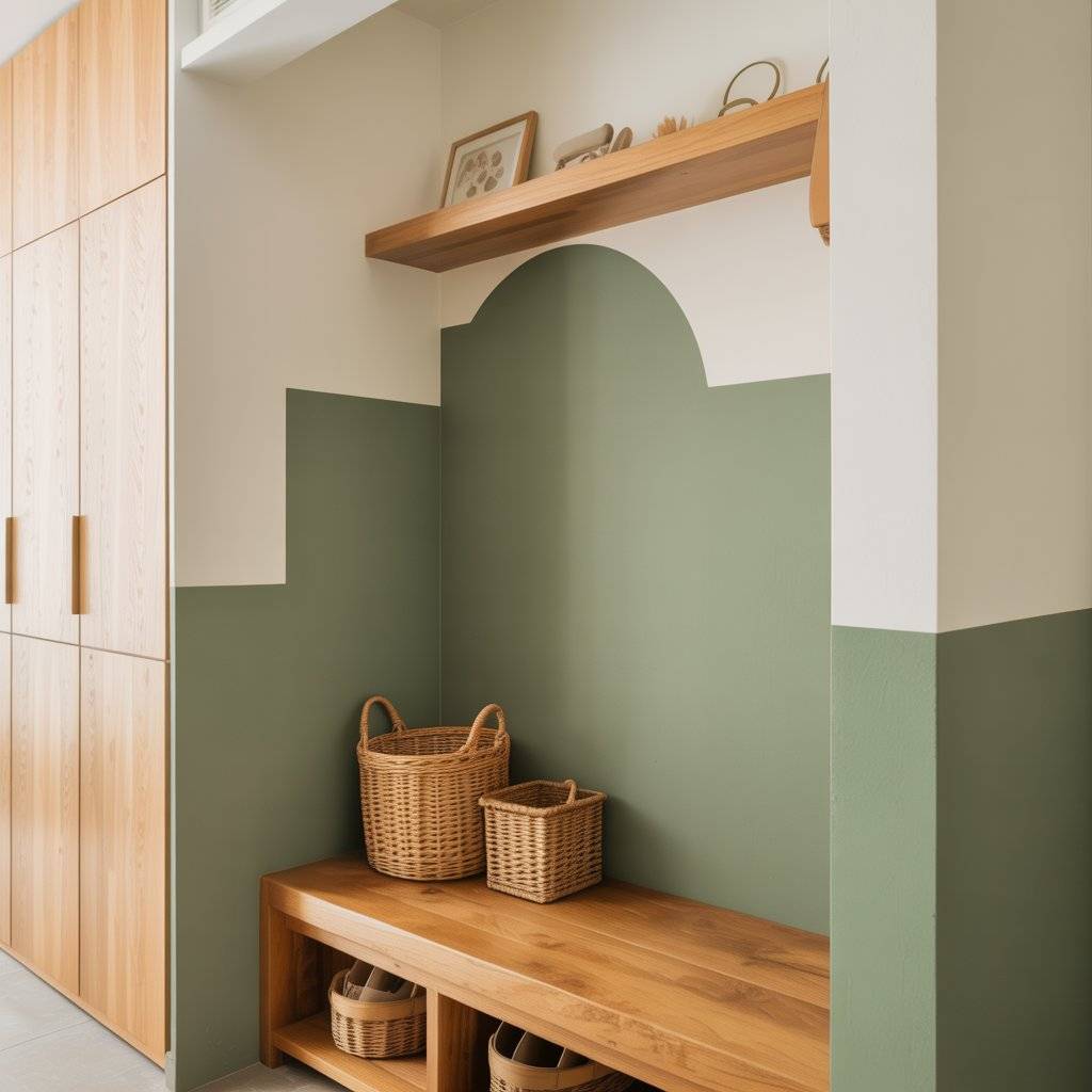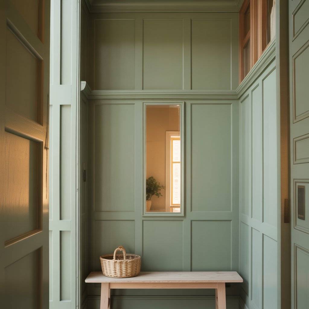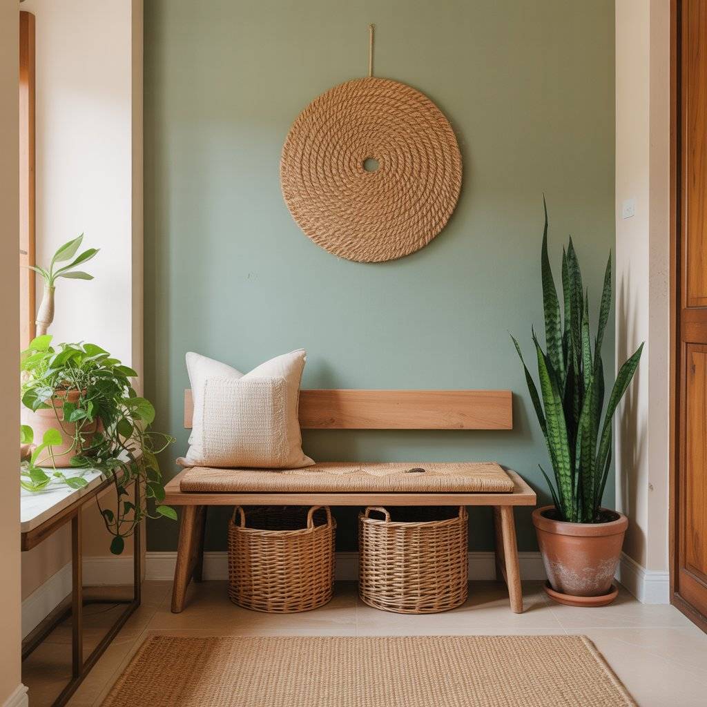 I’ve seen beautiful entryways where a sage green wall sits behind a small wooden bench and a few potted plants. The combination creates a calm, welcoming feeling right when someone walks in.