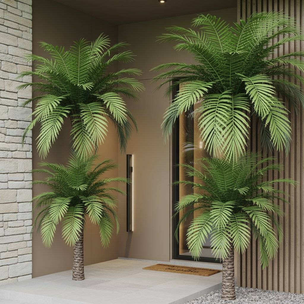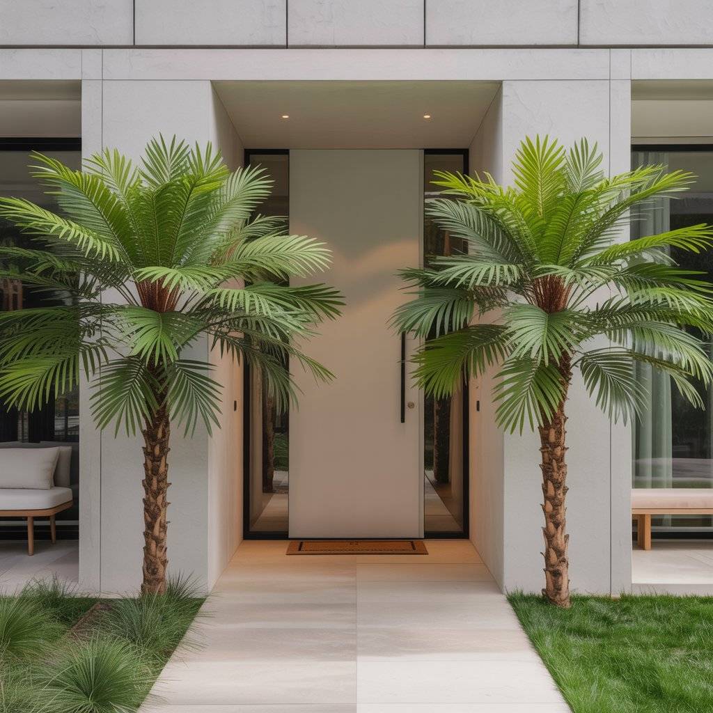 To complete the look, consider pairing the palms with a sleek door mat or a small bench. Even a simple setup like this helps define the entry area, making it feel more intentional and welcoming.