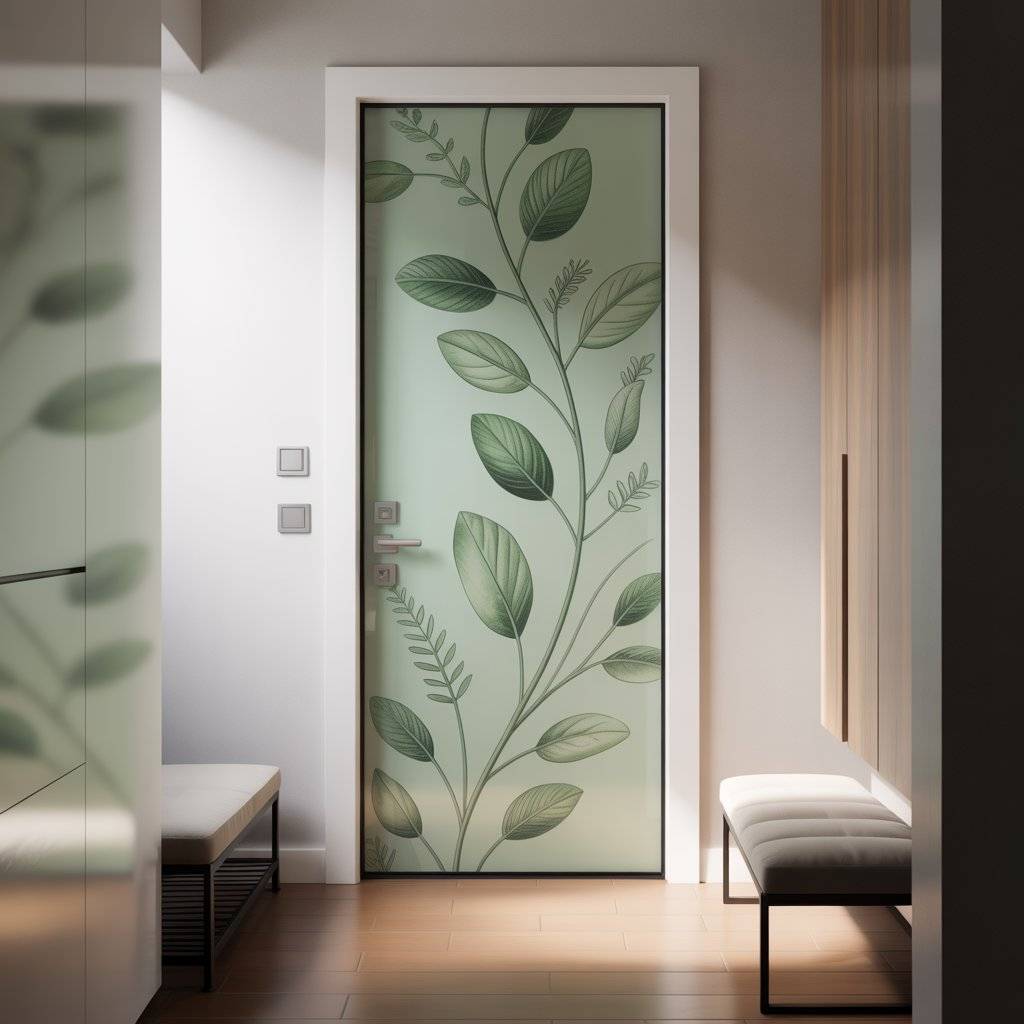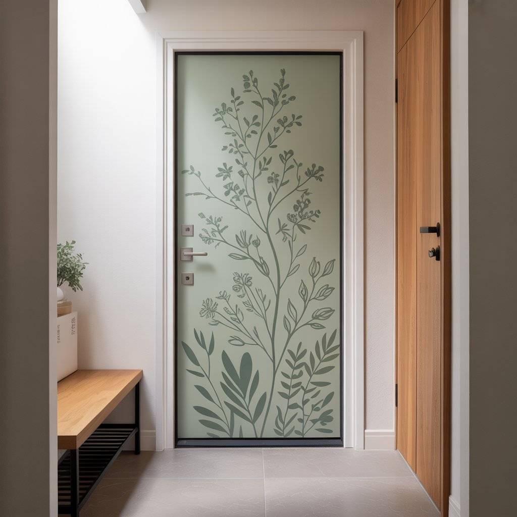 Often underestimated in entryway design, a thoughtful detail can instantly pull the space together and make it feel complete. A door with a modern floral pattern in sage green introduces a subtle touch of color without requiring any changes to your walls or existing furniture.