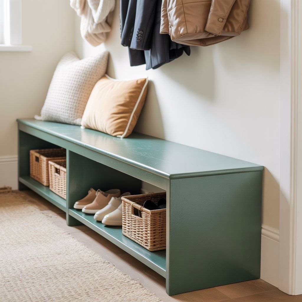 A sage green entryway bench is one of the easiest ways to combine style and function near the front door. I’ve seen this work well in small and medium entryways because it solves a real everyday problem people need somewhere to sit when putting on shoes.