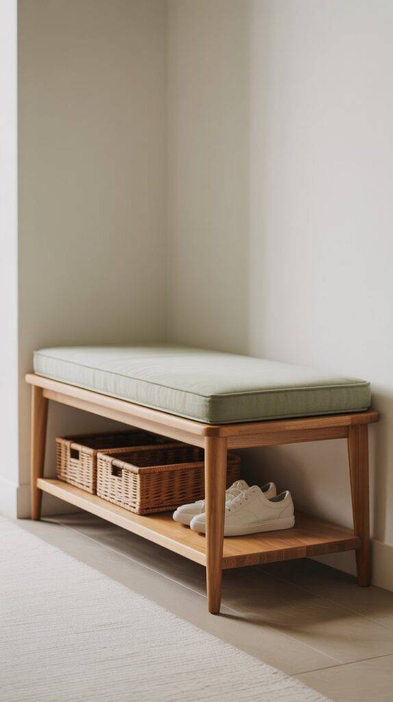 Look for benches that include hidden storage or an open shelf underneath. These designs help keep shoes, bags, or baskets organized so the entryway stays tidy. A bench with a soft sage green fabric cushion also adds a comfortable place to sit while still keeping the modern look.