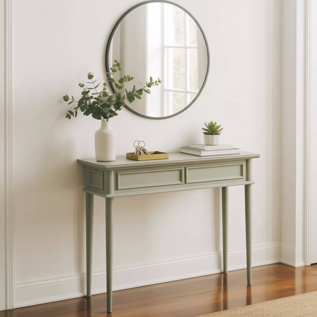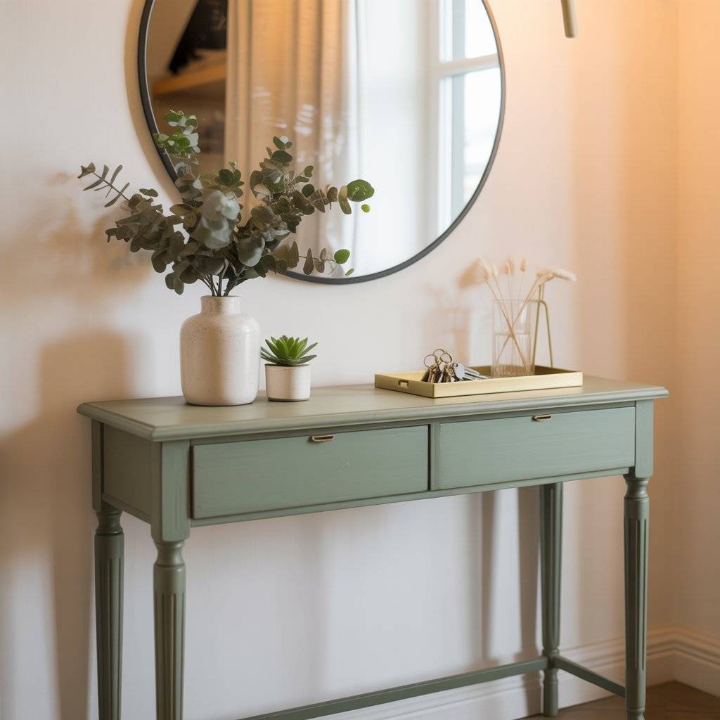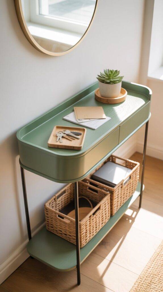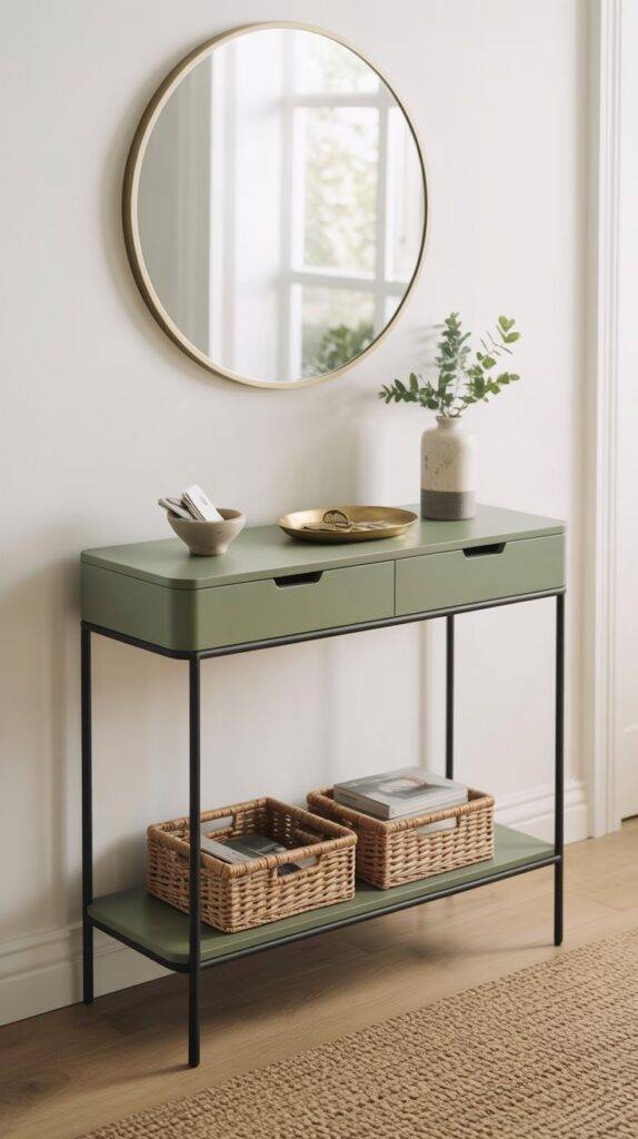 A slim console table in sage green can quickly give an entryway a finished look. I’ve noticed that many people struggle with empty wall space near the door, and a narrow table solves that problem without blocking the walkway.