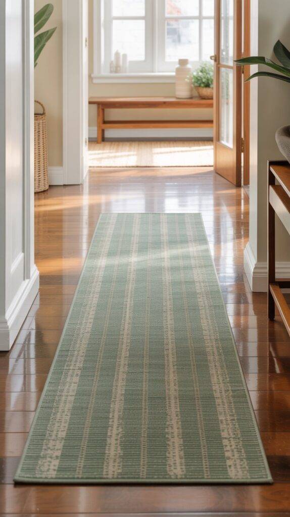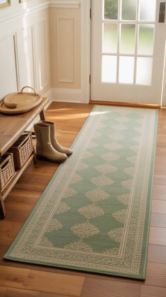 Entryway rugs handle a lot of daily foot traffic, so choosing the right one matters. A sage green runner rug works well because it introduces color while still hiding small marks from shoes or outdoor dirt.