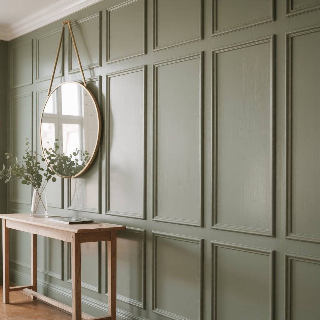 You don’t need anything complicated to do this. Simple wood trim boards attached to the wall can create the panel look. After painting everything in a soft sage green shade, the wall starts to feel more finished and intentional.