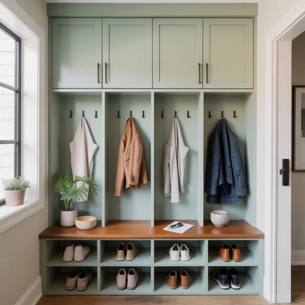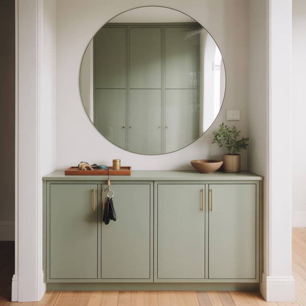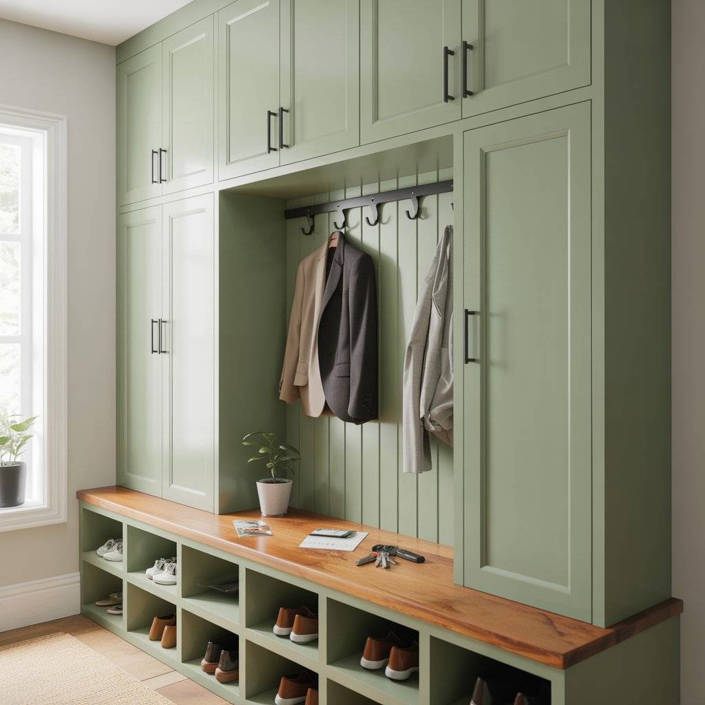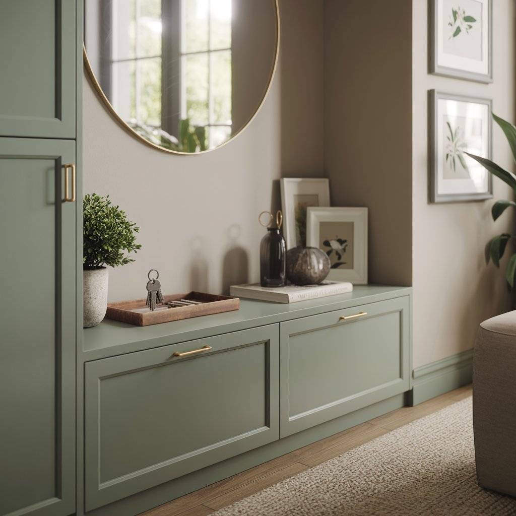 If you have a little more space in the entryway, built-in storage painted sage green can look beautiful and stay very functional. I’ve seen homeowners use simple cubby cabinets with hooks above them. Painting the whole unit sage green turns it into a feature instead of just storage.