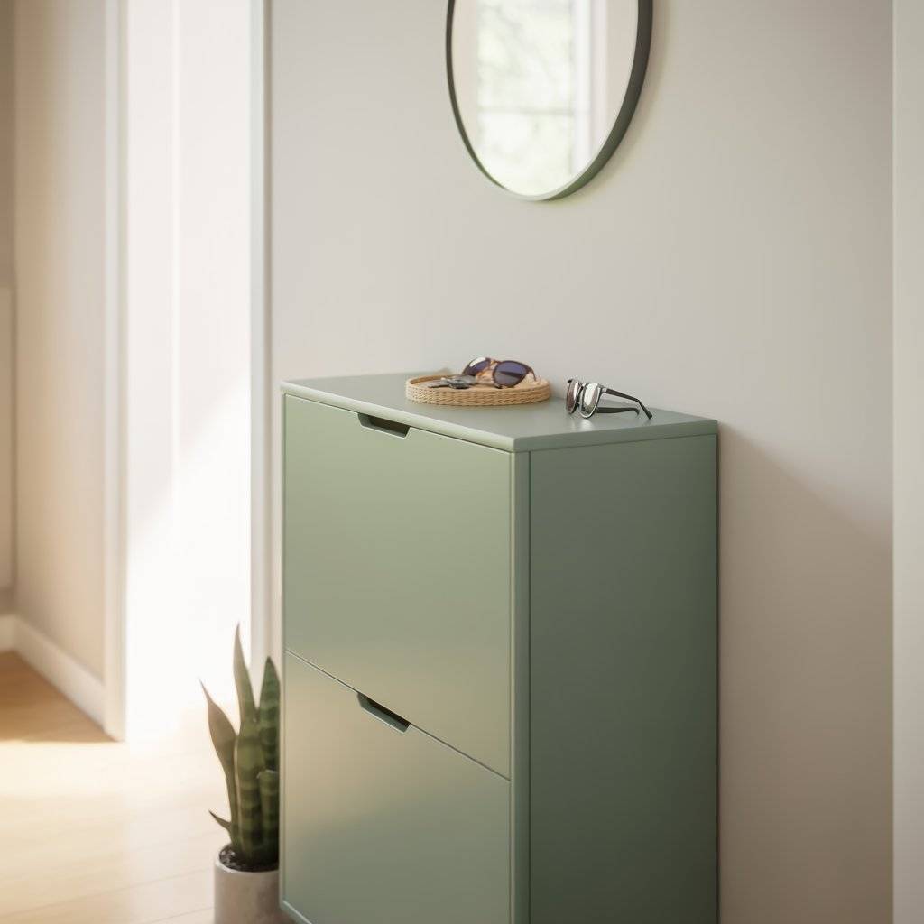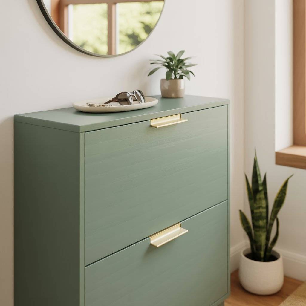 Shoes often create clutter in the entryway, so adding a sage green shoe cabinet can solve two problems at once. It keeps footwear organized while also adding a soft color to the room.